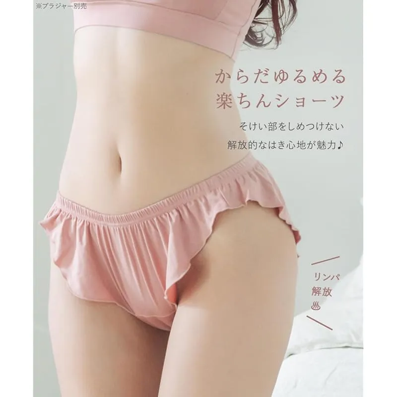 【鼠径部&リンパ開放で楽ちん! 食い込まないふんどしパンツ】無駄な装飾を省き、鼠径部のゴムを無くしたシンプルな無地ショーツ。ふんわり広がる裾のヘムラインにメローフリルをぐるっと一周施し、ひだが揺れてロマンティックな印象♪たっぷり生地が揺れるフレアの可愛さと、快適な着心地を両立しました!