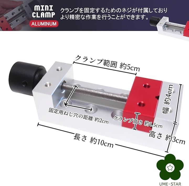 サイズ:長さ 約10cm 幅 約4cm 高さ 約3cm クランプ範囲 約5cm クランプ高さ 約1.5cm 固定用ねじ穴の距離 約2cm