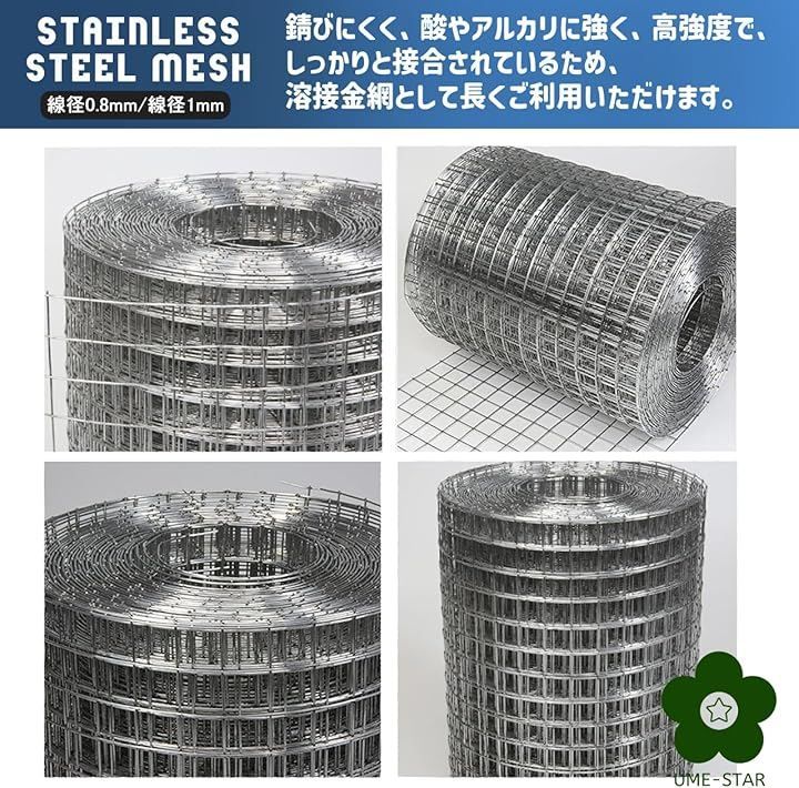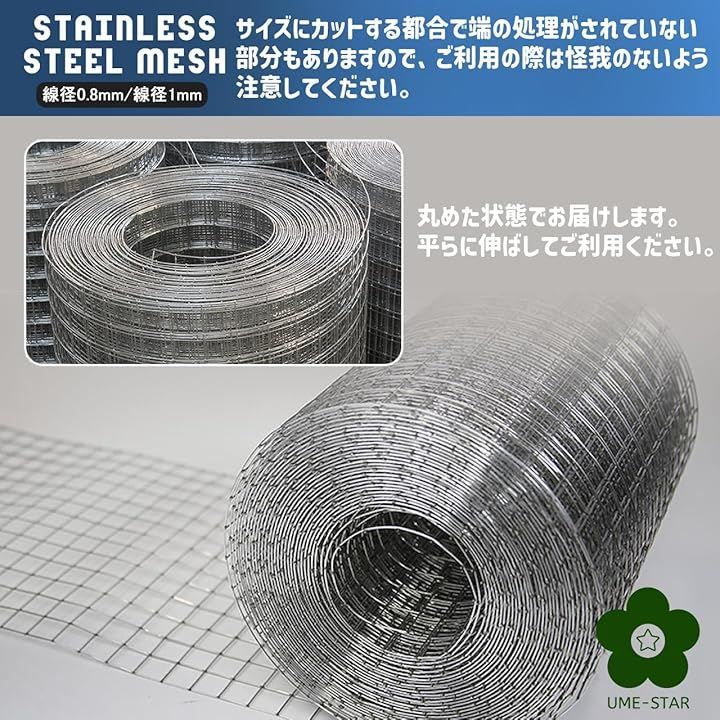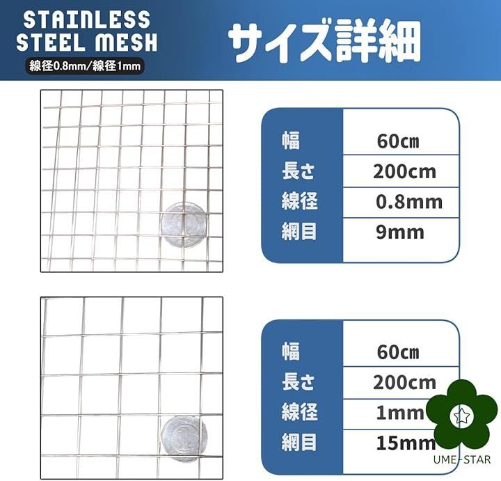 UME-STAR ステンレス 金網 メッシュ ワイヤーメッシュ 金網ネット ステンレス溶接メッシュ (シルバー, 幅60cm 長さ200cm 線径1mm 網目15mm)