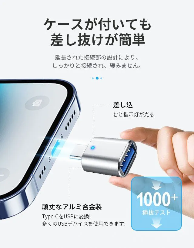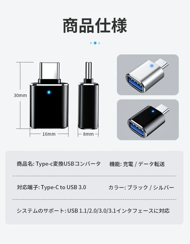 【ご注意】 *スマートフォンやタブレット端末はOTG機能対応機種のみ、本製品をご使用いただけます。 対応機種でも設定でOFFになっている場合は使用できないので、ご注意ください。 *Type-Cの映像出力機能には対応しておりません。 *動作しない場合、ケーブルをアダプタに挿す向きを反対側にしていただくと解消できる場合がございます。 *USB-A⇒Type-Cは本来規格外のご使用方法となります。全ての機種での動作を保証するものではございません。 予めご了承ください。個別機種の仕様等により充電またはデータ転送が対応できない場合がございます。