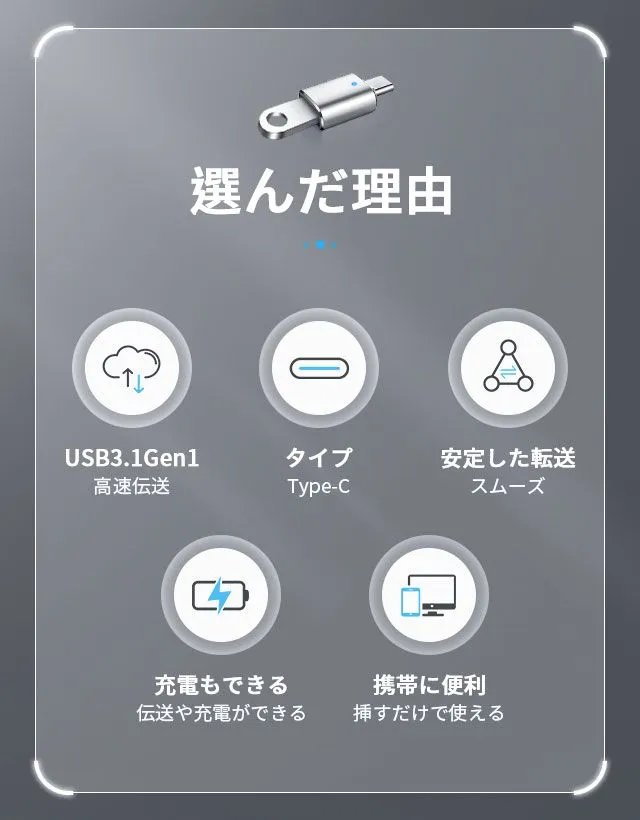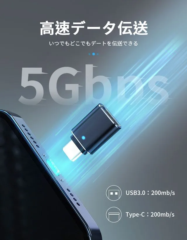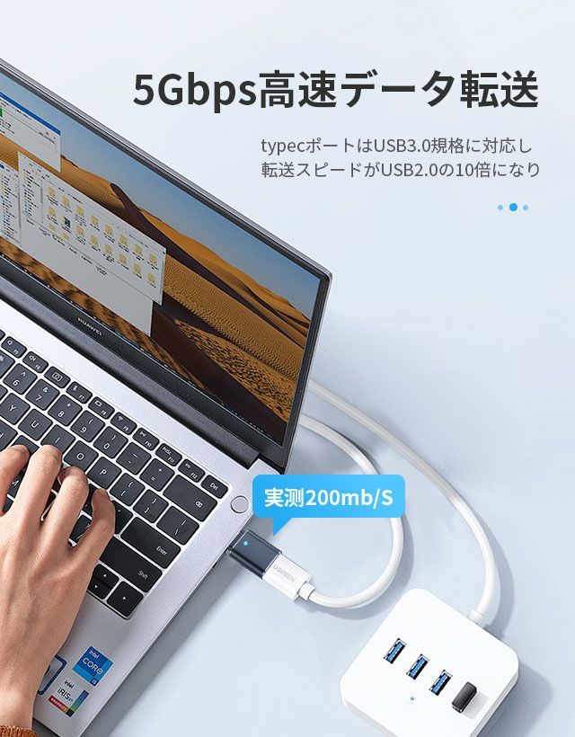 typecポートはUSB3.0規格に対応し、転送スピードがUSB2.0の10倍になり、最大5Gbpsのハイスピードでデータ転送できます。大容量の映画、ファイル、オーディオ,イメージ等がわずか数秒で転送完了できます。