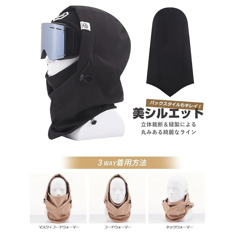 【3WAY】マスク付きフードウォーマー:首元~頭部を隙間なく覆い防寒性バッチリ!ゲレンデでの急な吹雪にも対応できます。フードウォーマー:マスクはドローコードを緩めて簡単に下げられます。ネックウォーマー:フードを下げてネックウォーマーにした時も、ペタンとならずに立体的に首周りを温めてくれます。