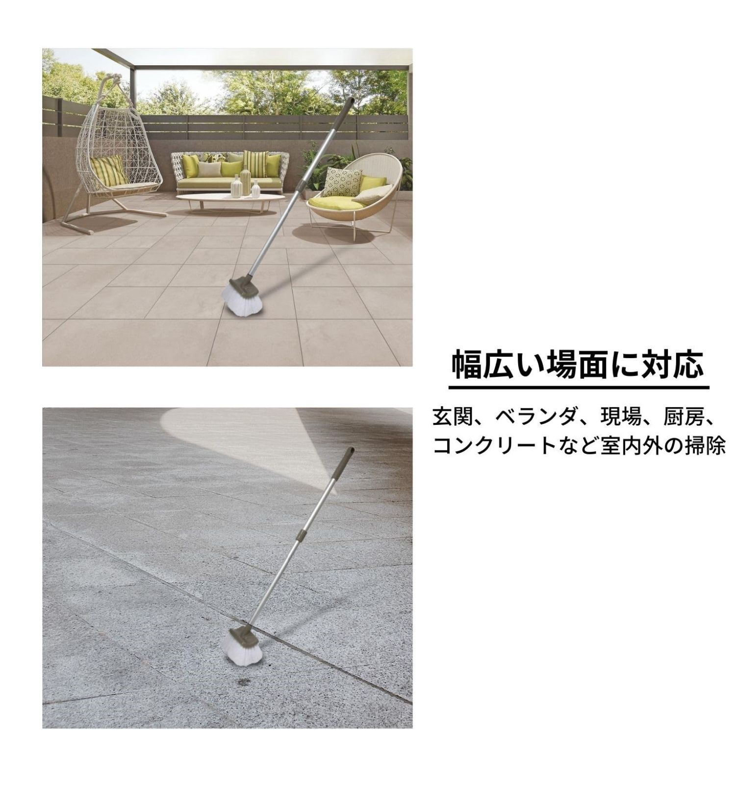 【幅広い場面に対応】 玄関、ベランダ、現場、厨房、コンクリートなど室内外の掃除に最適です。