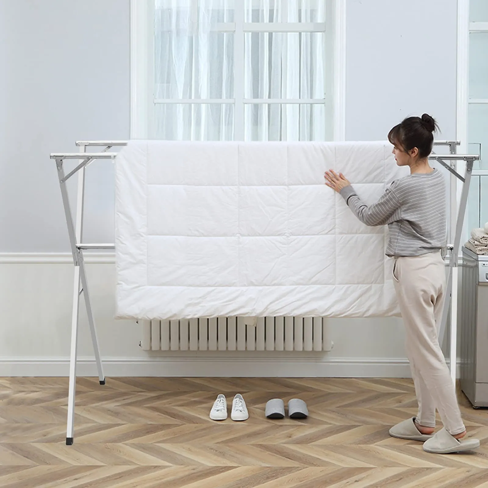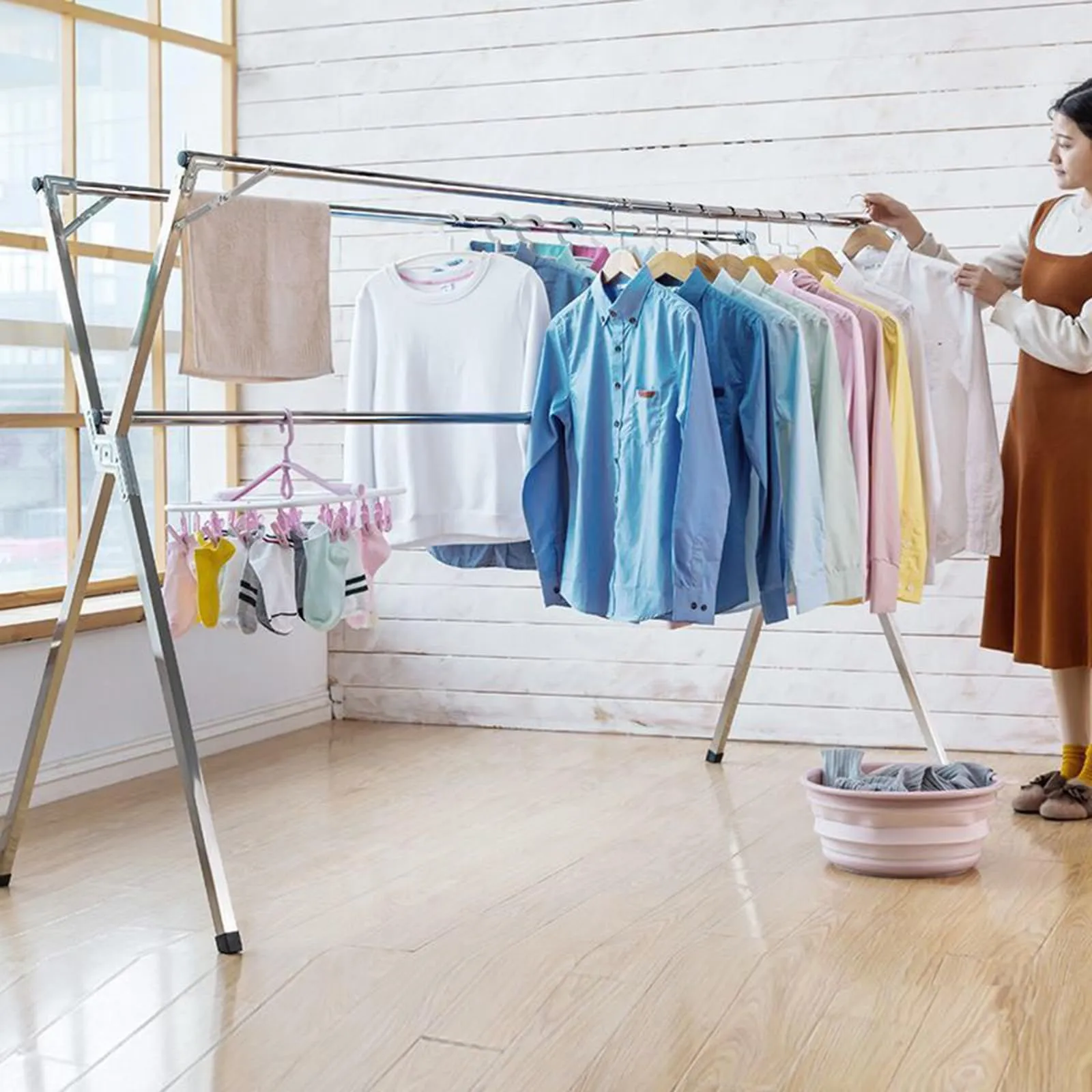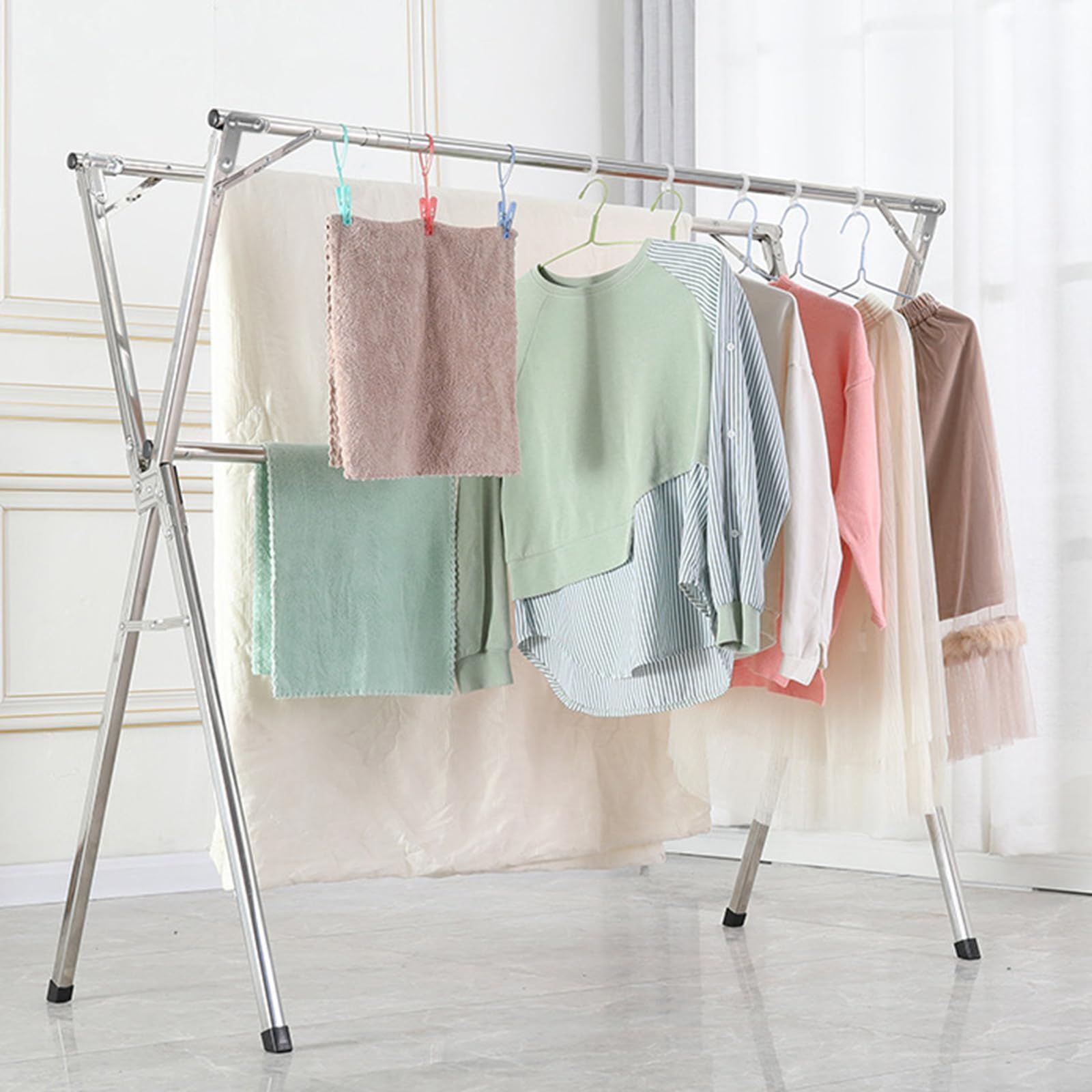 【安定衣類ラック】安定乾燥ラックは、中央に固定ロッドを追加することで、乾燥時の安定性を高め、強風を恐れません。そして滑り止めの足、より滑り止めと床を保護します。それはより多くの衣服と安定した強さを掛けることができます。