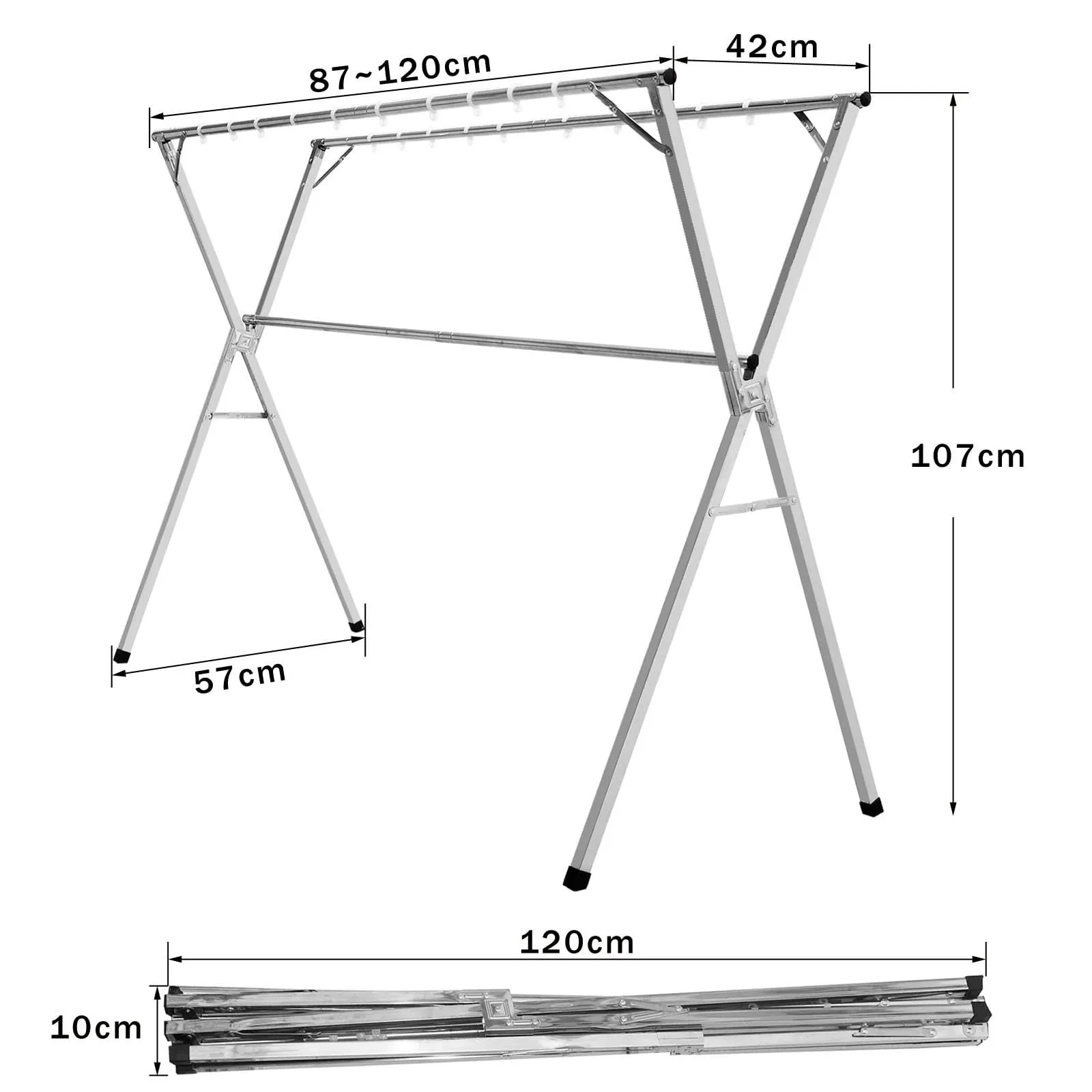 【拡張可能な物干しラック】幅87 ~ 120cm。高さ107.5cm。約3.4kg。収納時:(約)幅120cm。定評のある折りたたみ機構を備えているため、使わないときは折りたたんでどこにでも収納できます。女性やお年寄りでも簡単に使えます。