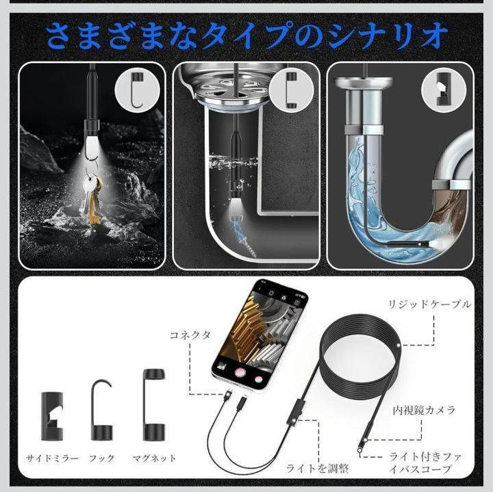 「幅広い用途&100%満足サービス」ファイバースコープは水中エリア、隙間、穴の検査が簡単に行えます。 あらゆる種類の暗い場所や暗い場所、湿った場所や濡れた場所などに適しています。ファイバースコープ*1、5Mセミリジッドケーブル*1、付属品はマグネット*1、フック*1、ミラー*1、保護キャップ*1、