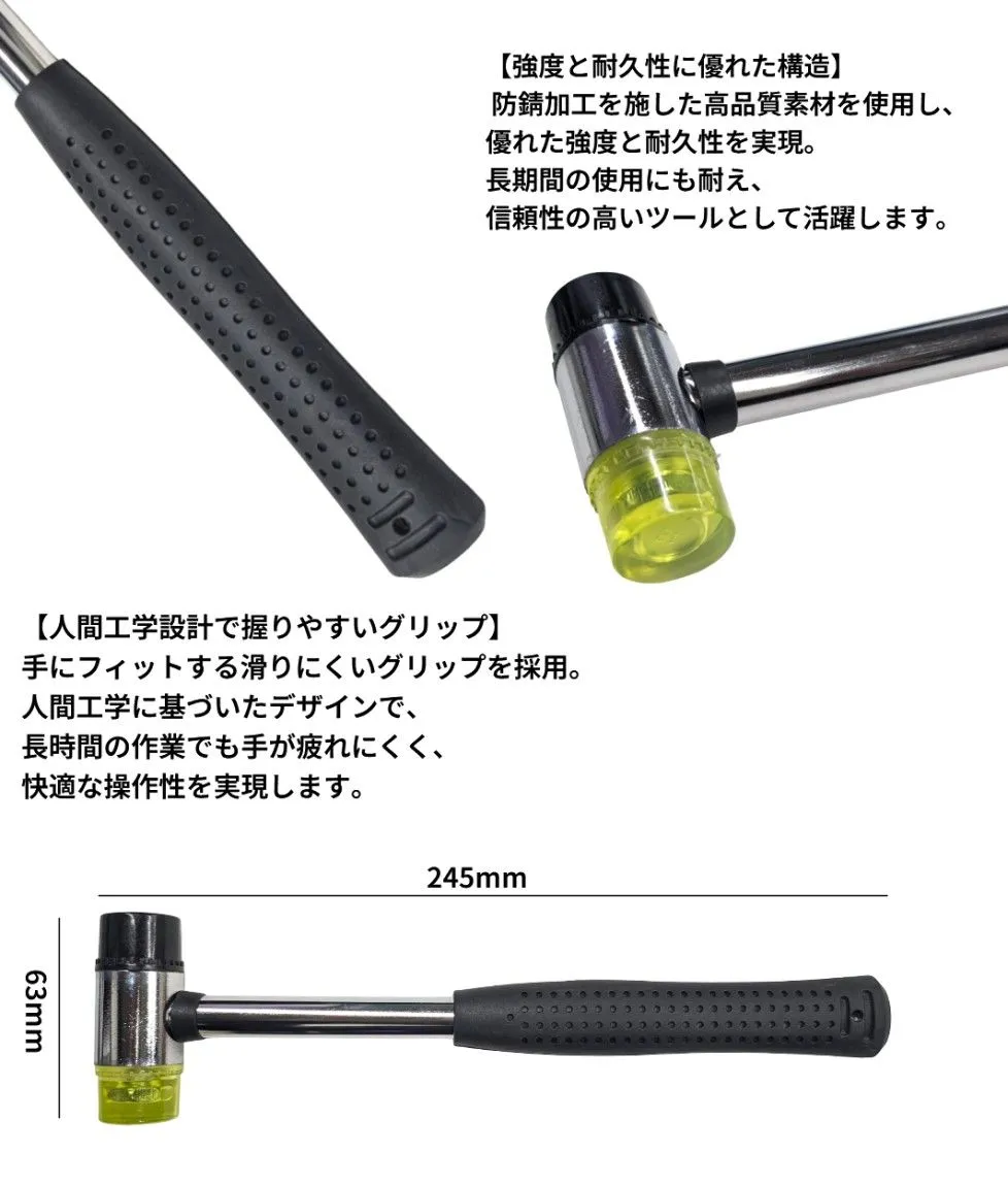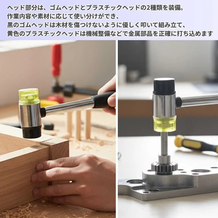 ●ゴム&プラスチックの両頭ハンマー ヘッド部分は、ゴムヘッドとプラスチックヘッドの2種類を装備。 作業内容や素材に応じて使い分けができ、黒のゴムヘッドは木材を傷つけないように優しく叩いて組み立て、黄色のプラスチックヘッドは機械整備などで金属部品を正確に打ち込むことができ、車のデントリペア作業においても、打撃の強さを調節しながら使用するのにぴったりです。