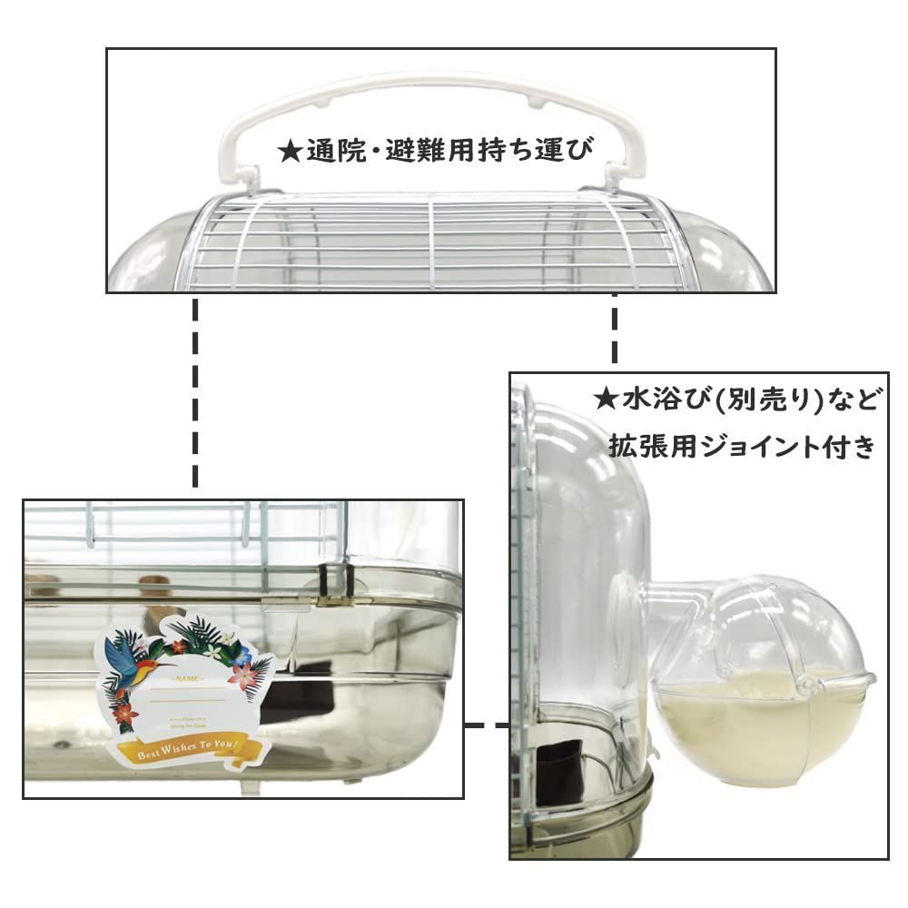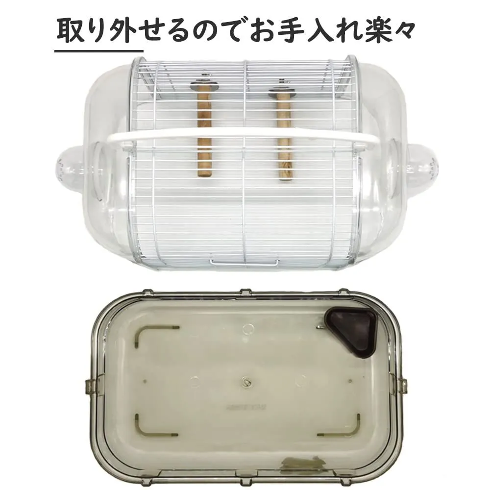 天井とサイドはクリアで圧迫感がなく、どの角度からも小鳥の様子が見やすい。オカメインコでもゆったりなサイズで愛鳥がゲージの中で充分動き回れます。
