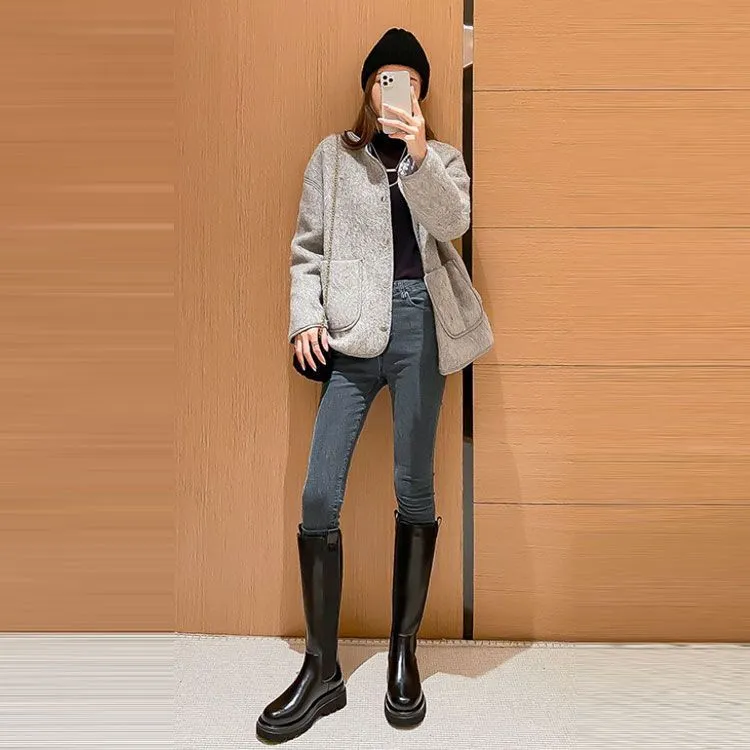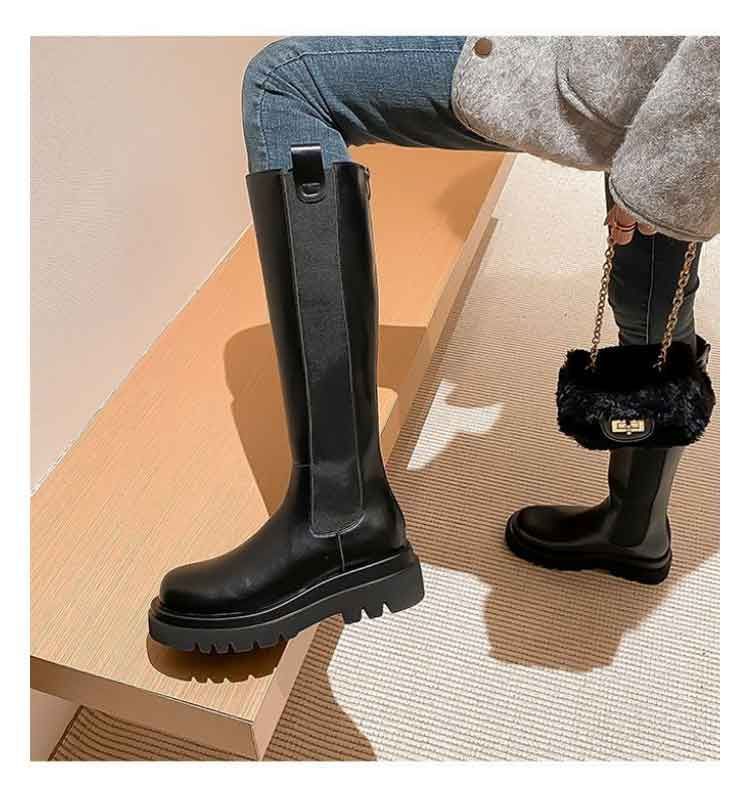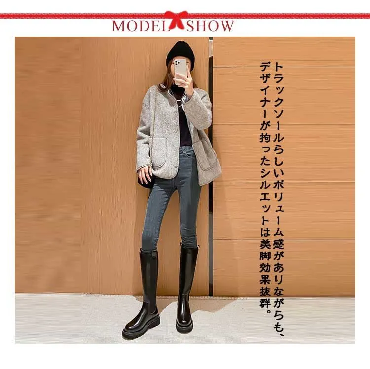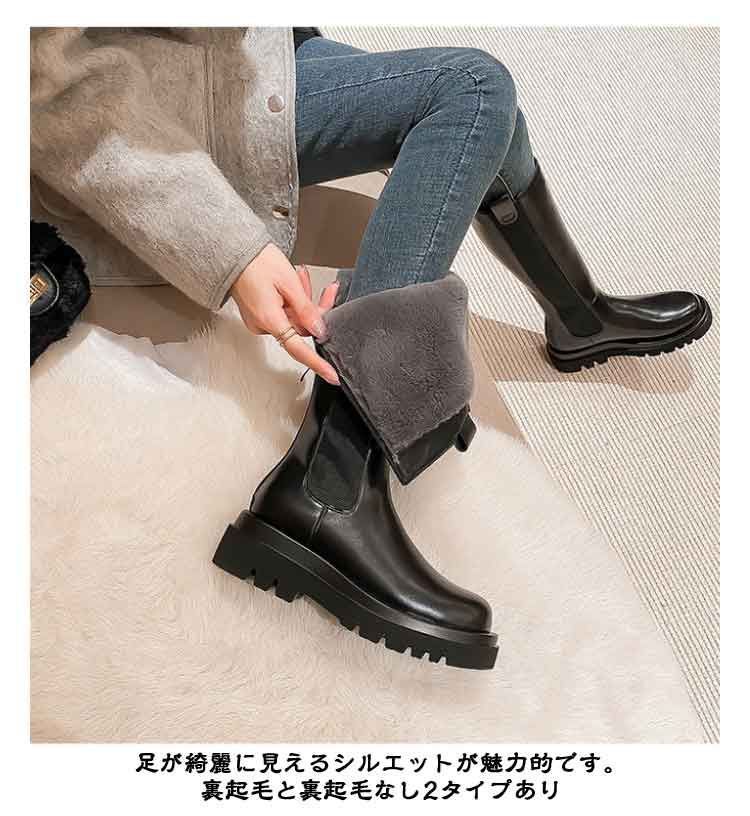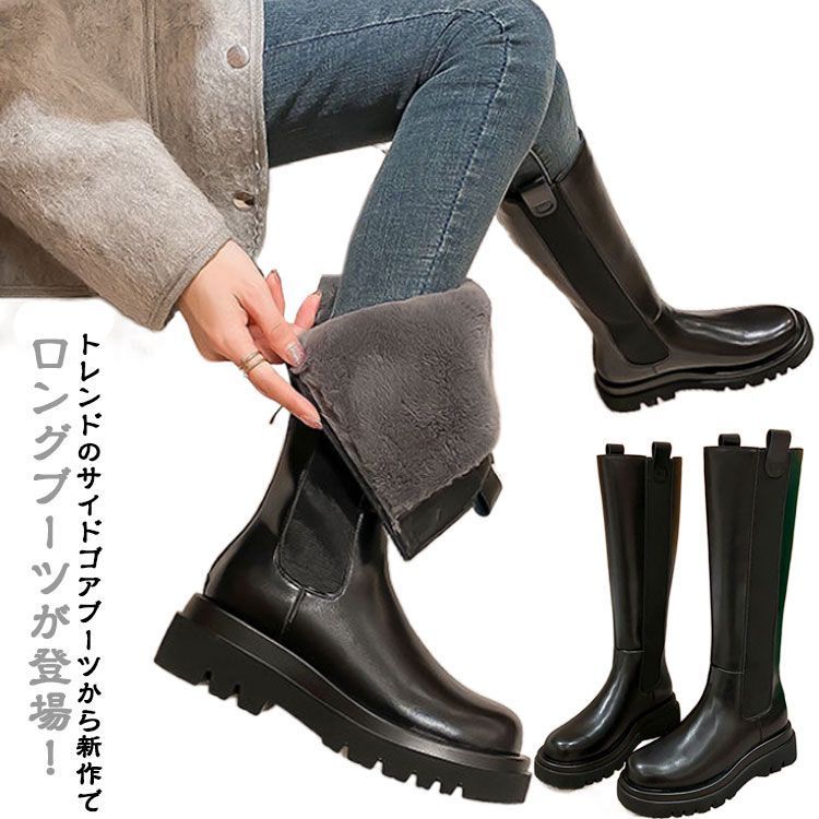 ■沖縄・離島は配送料が異なります。ご購入前にコメントをお願いいたします。 商品説明 サイズ * 22.5cm / 23.0cm / 23.5cm / 24.0cm / 24.5cm / 25.0cm サイズ対応表 * 35: 22.5cm * 36: 23.0cm * 37: 23.5cm * 38: 24.0cm * 39: 24.5cm * 40: 25.0cm 商品詳細 * ヒール高: 5.5cm (インヒール: 2.5cm) * 素材: PU * 色タイプ: 裏起毛 / 裏起毛なし --- トレンドのサイドゴアブーツから新作ロングブーツが登場! 足が綺麗に見えるシルエットが魅力的です。 * 裏起毛と裏起毛なしの2タイプをご用意。 * トラックソールらしいボリューム感がありながら、デザイナーがこだわったシルエットで美脚効果抜群。 * バックにフルジップ採用で、ファスナーを開閉するだけでスムーズな着脱が可能。 * 裏起毛タイプは、筒部分の裏側からつま先までしっかり保温。 * 安定感のある厚底なので、安心してスタイルアップを叶えます。 カジュアルすぎずキレイめに履けるので、幅広いスタイリングにマッチする万能型ブーツです。