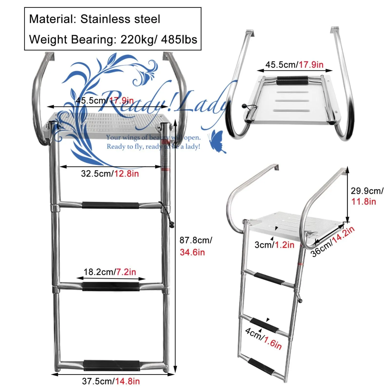 ●仕様:仕様: -材料:316ステンレス鋼 - サイズ: -展開された長さ: -2ステップ:58cm / 22.5in -3ステップ:87.8cm / 34.6in -プラットフォームの幅:45.5cm / 17.9in -ステップ幅:18.2cm / 7.2in -折りたたんだ幅:45.5cm / 17.9in -セントラム幅:37.5cm / 14.8in -表面仕上げ:研磨済み -耐荷重:220kg / 485ポンド
