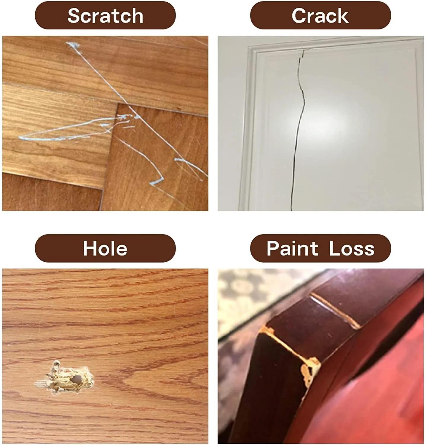 【適用範囲が広い】▲木製家具の細かい擦り傷、凹み傷、えぐれ傷、小さな変色、かけ、塗装がれ、ひび割れ、フローリングのペットがつけた傷、家具の移動や引っ越し作業による傷、飲み物をこぼしてできたシミやカビ、日々の掃除を怠って付いた汚れ、落書きを補修します。▲補修クリームが乾いた後、色あせ防止機能*防水性のあるつやだしニスを塗布することをお勧めします。