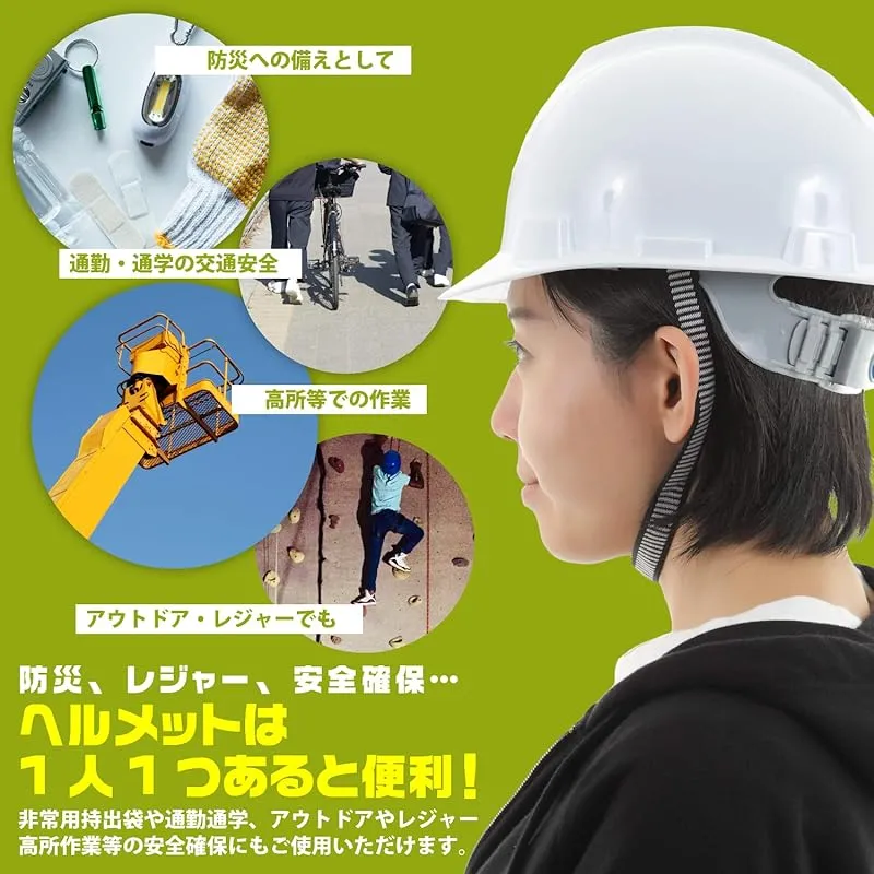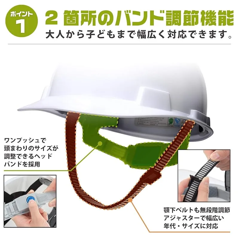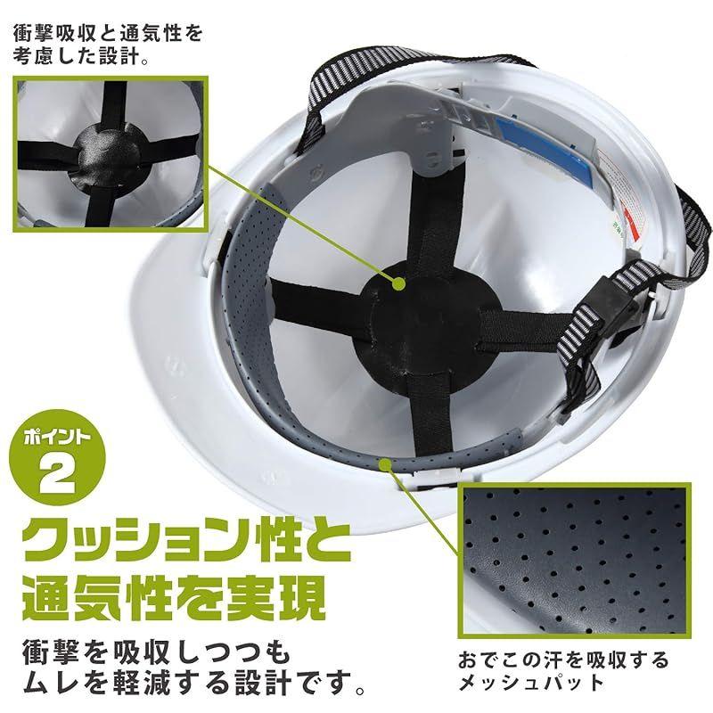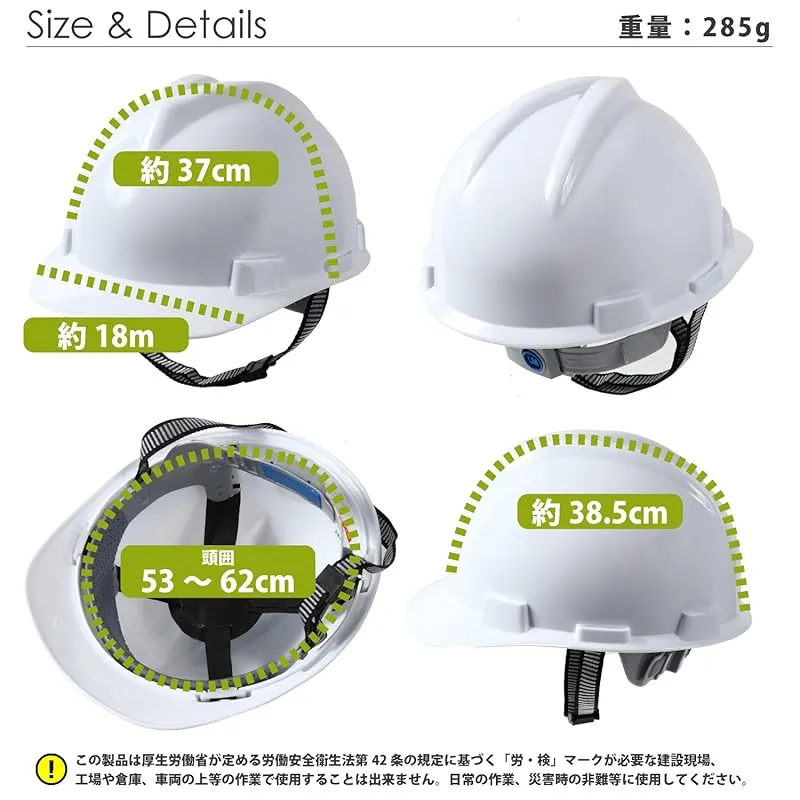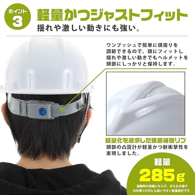 【商品概要】 子供から大人まで使用できるように、ヘッドバンドを調整することで約47-62cmという幅広い頭周囲に対応可能。 軽量化を追求し、安全を確保する為にヘルメット頂部に補強リブ(凸)を設けています。 ワンプッシュで頭まわりのサイズが調整できるヘッドバンドを採用で使い勝手が向上しました。 「保護帽」の着用を義務付けられた作業には使用しないで下さい。 初期不良以外での返品、交換はお受けできませんのでご理解の基お買い求めください。 表示在庫数以上の購入をご希望の場合は、問い合わせフォームよりご連絡下さい。