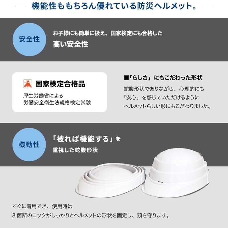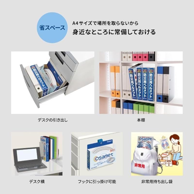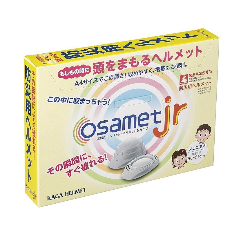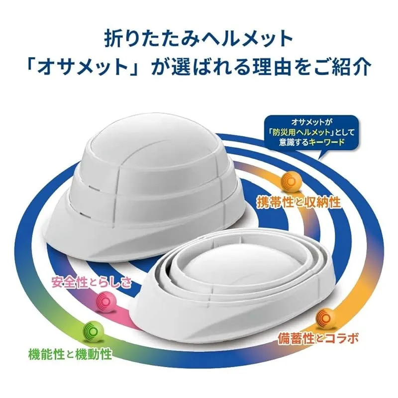 【飛来・落下】試験も取得した折りたたみ可能な防災用ヘルメットです。 地震 洪水 ゲリラ豪雨 などの被災時の備えて。避難訓練にも。 防災用品はかさばりやすく、場所を取るもの。そんなお悩みはオサメットが解決します。 強化プラスチック製で耐久性もしっかり。 45mm幅まで折り畳めるので、収納・保管に優れています。 ご自宅、店舗、事務所、会社などの施設の家具、棚、安全用品コーナーetc... 様々な場所でしっかりコンパクトに並べて納められます。 ご家族、従業員様の安全を守るためまとめ買いもお受けできます。 後部のスライド式ヘッドバンドでサイズ調整が可能です。 オサメット:55~64cm オサメットジュニア:50~56cm ※大人でも頭の小さな方はジュニアサイズがおススメです。 グッドデザイン賞 2018受賞!