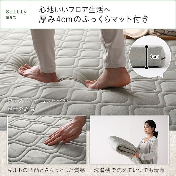 ■心地いいフロア生活へ厚み4cmのふっくらマット付き ウレタンフォームパッドが足音を軽減 ・キルトの凸凹とさらっとした質感 ・洗濯機で洗えていつでも清潔
