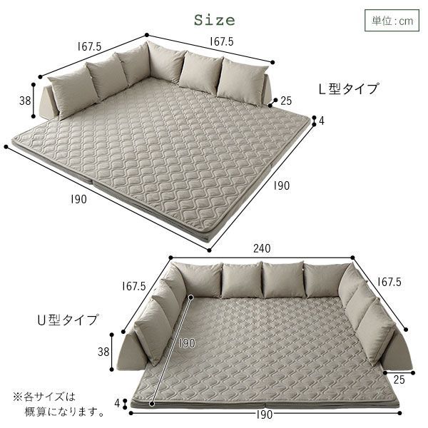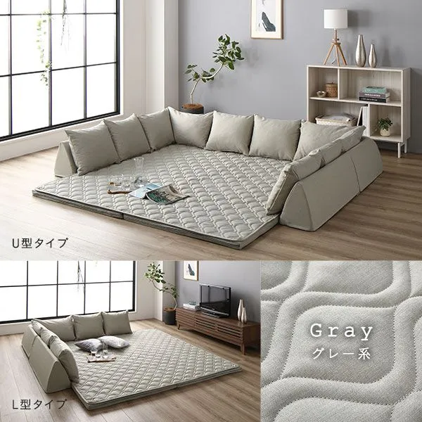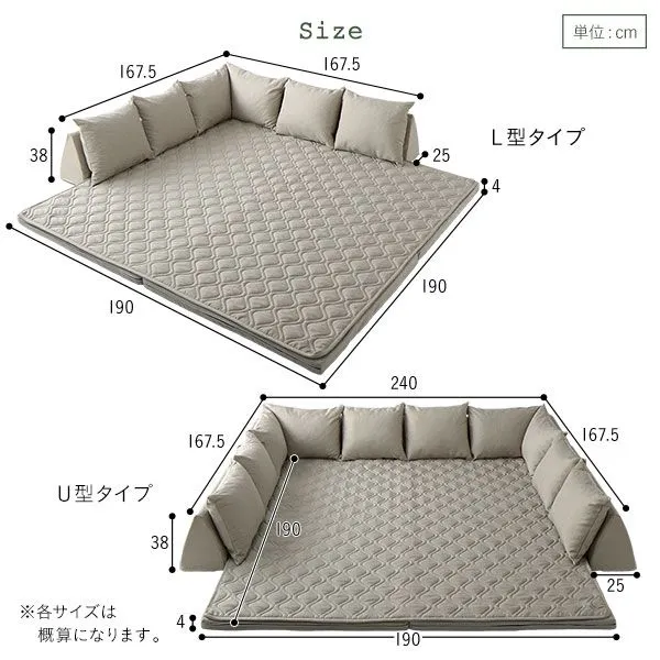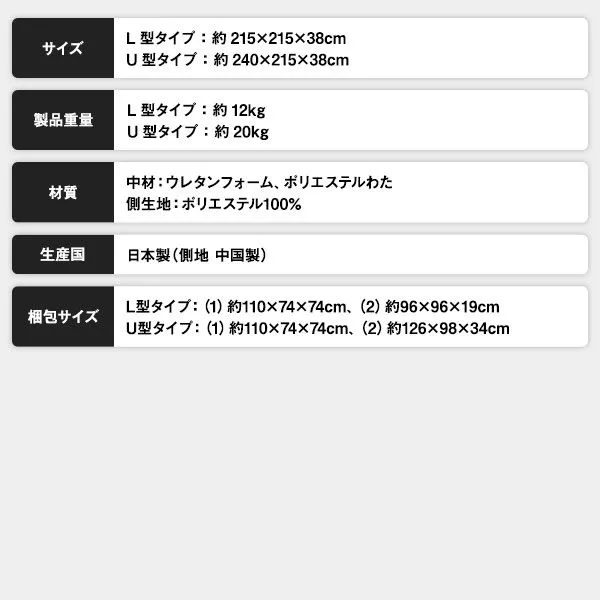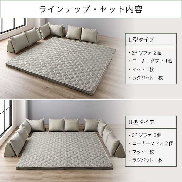 ■ラインナップ・セット内容 L型タイプ ・2Pソファ 2個 ・コーナーソファ 1個 ・マット 1枚 ・ラグパット 1枚 U型タイプ ・2Pソファ 3個 ・コーナーソファ 2個 ・マット 1枚 ・ラグパット 1枚