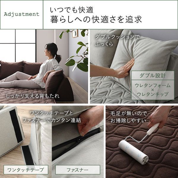 ■いつでも快適暮らしへの快適さを追求 ・しっかり支える背もたれ ・ダブルクッションでふっくら ・ワンタッチテープとファスナーで簡単連結 ・毛足が無いのでお掃除しやすい