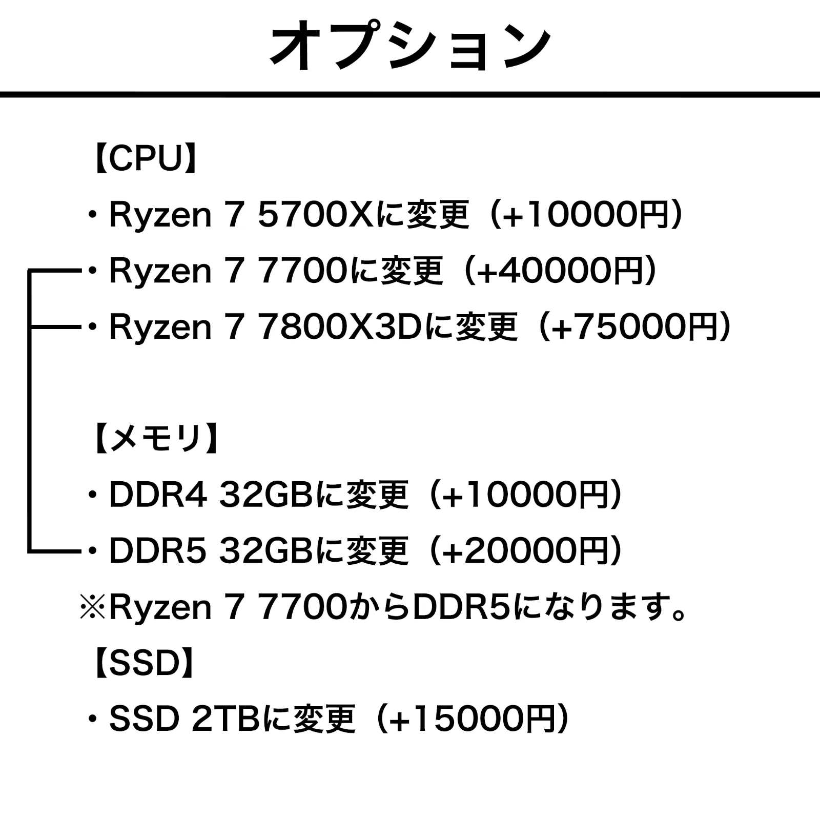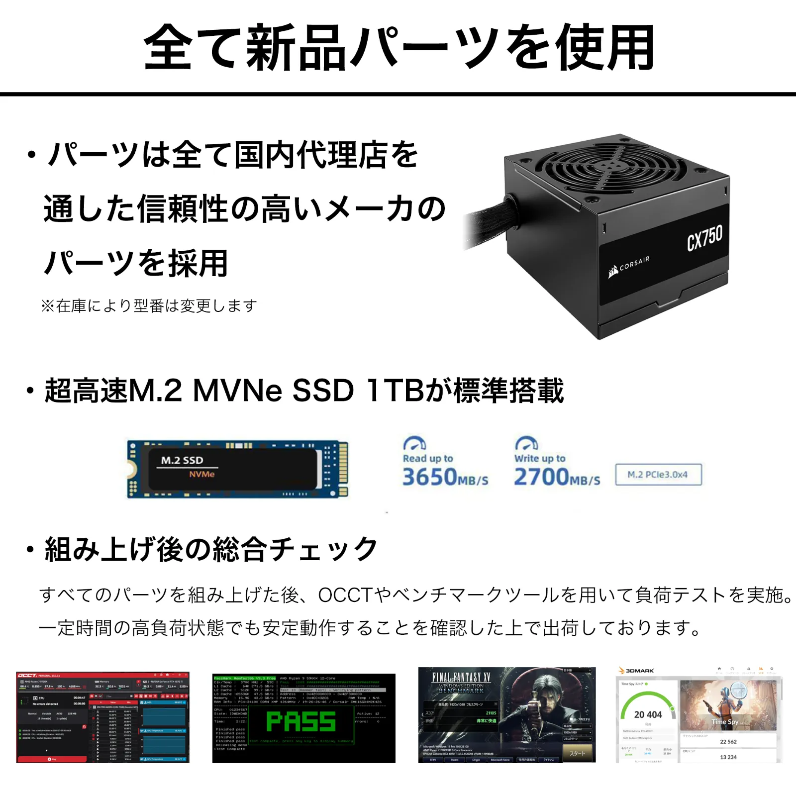 【注意事項】 ※ケース前面のType-C端子はマザーボードがA520,A620の場合使用できません。 ※写真と異なるメーカー・形状のグラフィックボードが搭載される場合がありますが、性能は同等品となります。