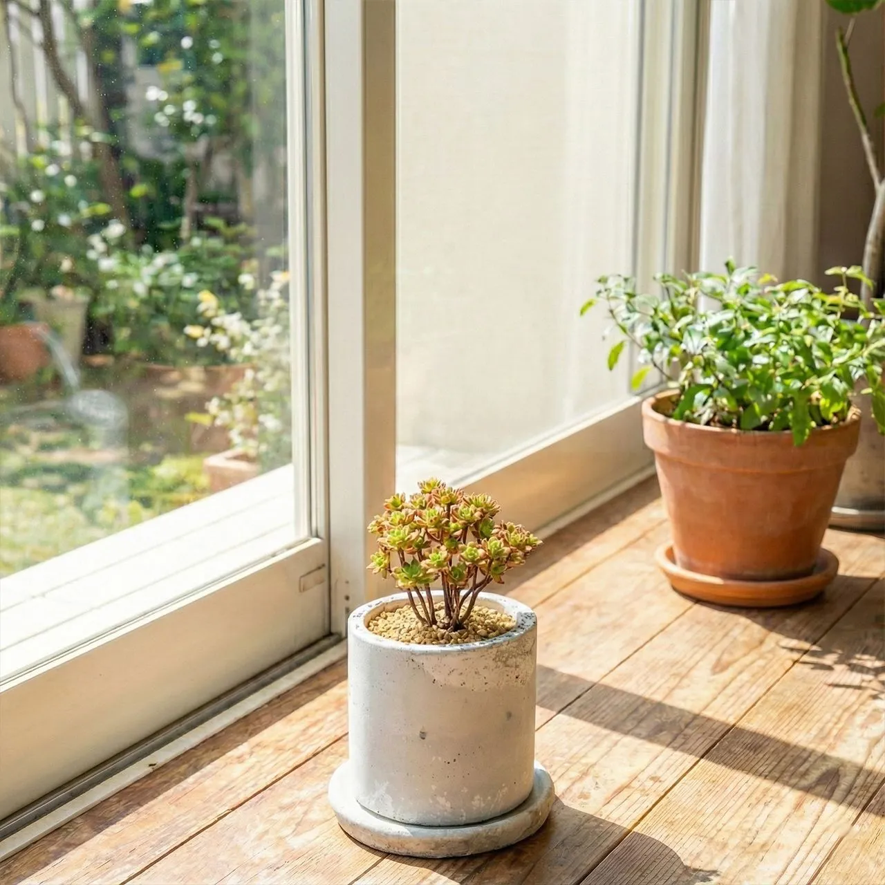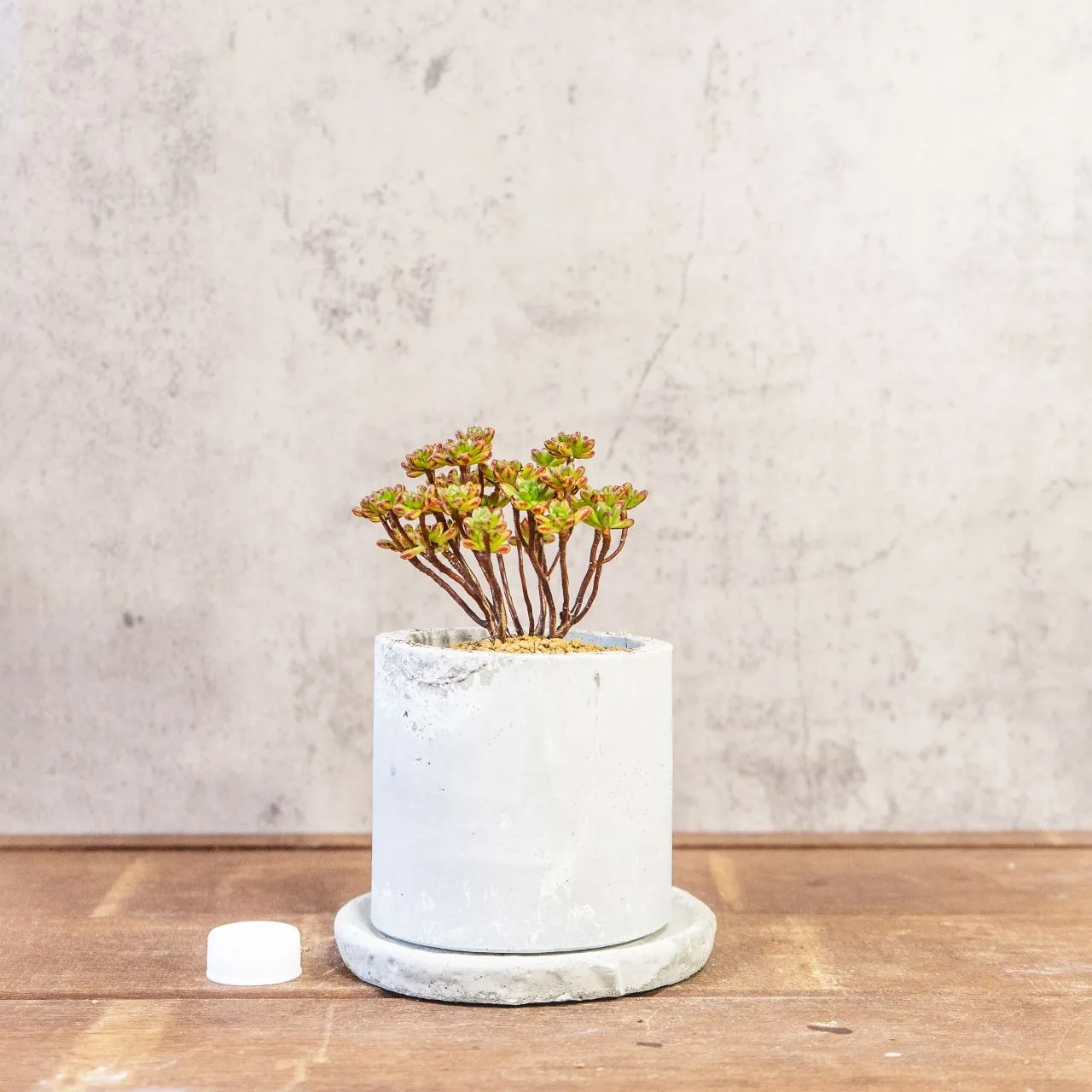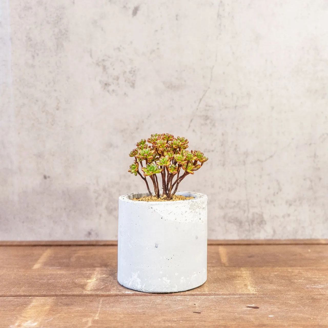 【手づくりモルタル鉢】。 ミニマルな質感が植物と相性抜群で、飾るだけでお部屋の雰囲気を変えてくれます。 ✨ ここがポイント! ・ユニークな樹形:趣のある盆栽風仕立ての一点物 ・美しい彩り:紅葉した肉厚ロゼットが魅力のミニ株 ・根にやさしい:乾きやすいモルタル鉢で根腐れを防止 ・管理シート付:初心者の方も安心の育て方ガイド同封