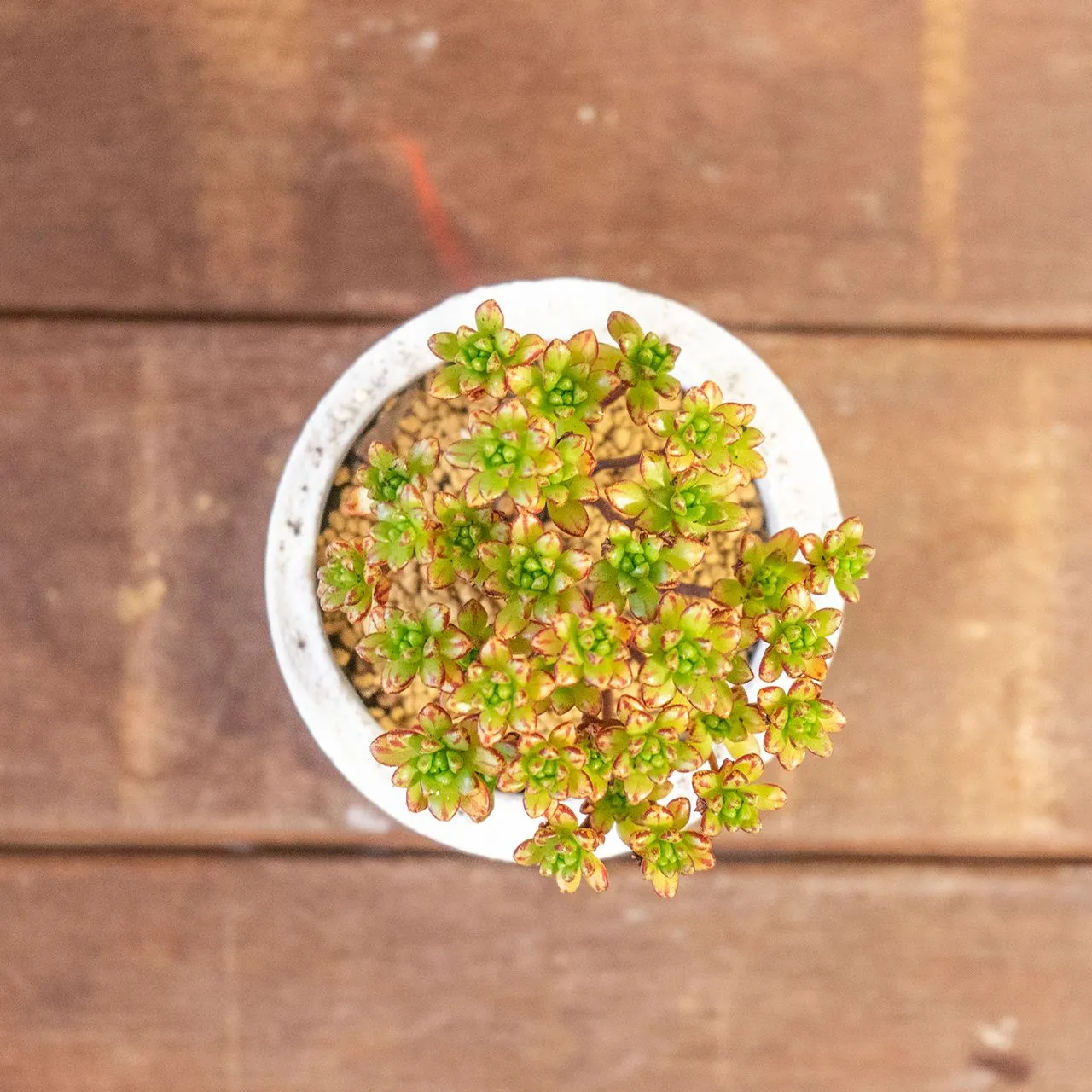 ■ 商品情報 ・植物名:アエオニウム・小人の祭り錦 ・サイズ:全長 約18cm / 鉢幅 約9cm ・用土:排水性を重視した乾きやすい配合土 ・鉢:オリジナルモルタル鉢(ライトグレー・鉢底穴あり) ※鉢と同素材の