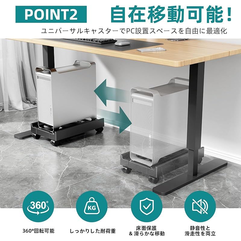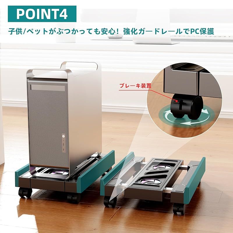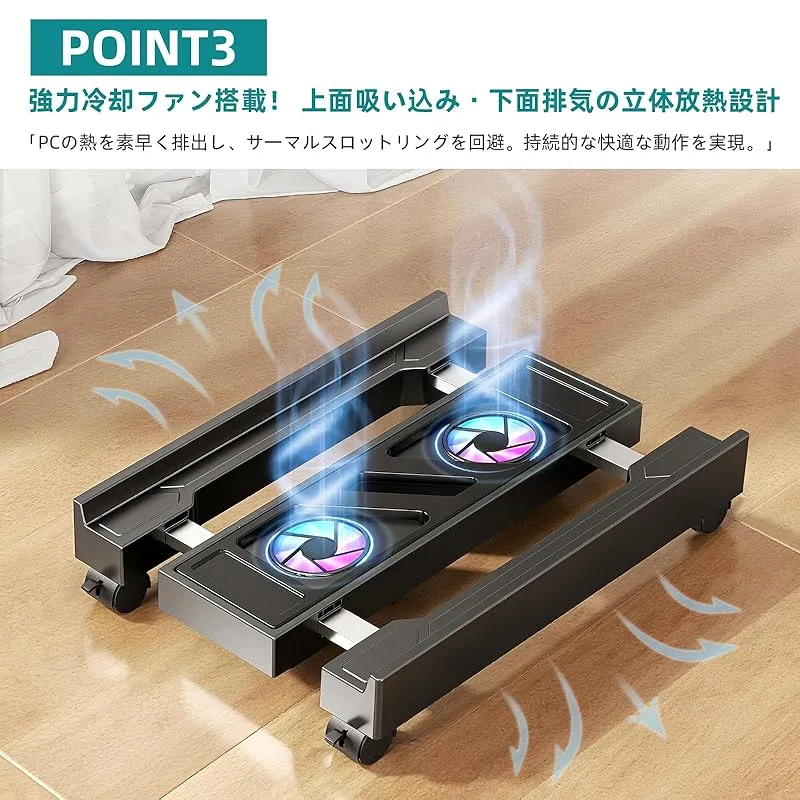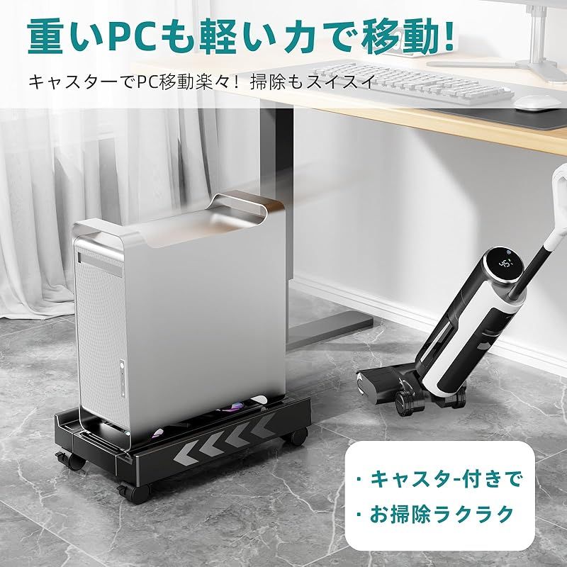 【ほこり対策】高さ6cmの浮遊設計+底面防塵メッシュでホコリをブロック。底が開いているため、床から十分な距離が確保され、冷却とほこりの侵入が最小限に抑えられます。 頑丈で車輪が付いているため、コンピュータを簡単に移動して周辺機器を掃除したり取り付けたりできます。