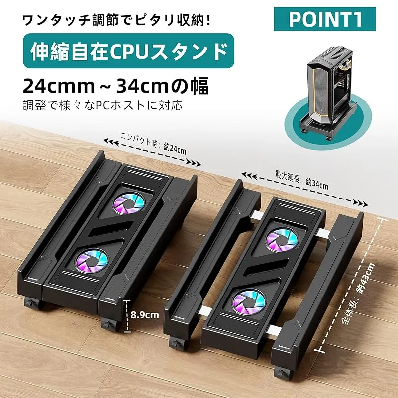 【サイズ無段階調節】幅24~34cmの無段階サイズ調整により、ミニタワーからフルタワーまであらゆるPCケースに対応。ワンタッチロック機構でがたつきゼロの安定固定を実現。大型コンピュータスタンドとして最適な設計です。(ご注意:キャスターの取り付け時は「カチッ」と音がするまで確実に挿入してください)