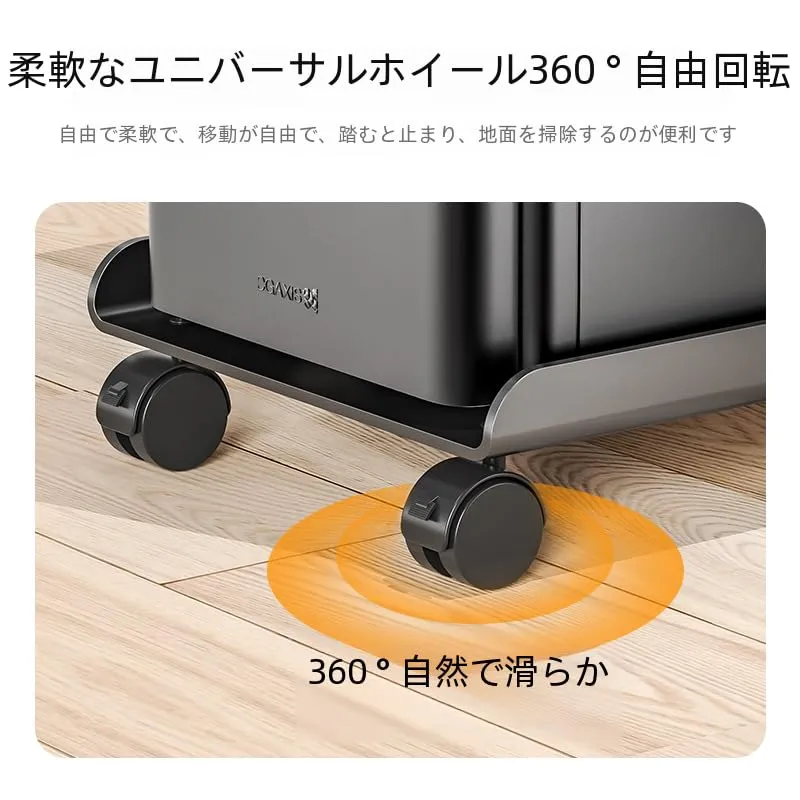 【床を清潔に保つ】 PCを床に直接置くと掃除が面倒ですが、このスタンドにはキャスターが付いており、移動や掃除が簡単です。床を常に清潔に保つために役立ちます。