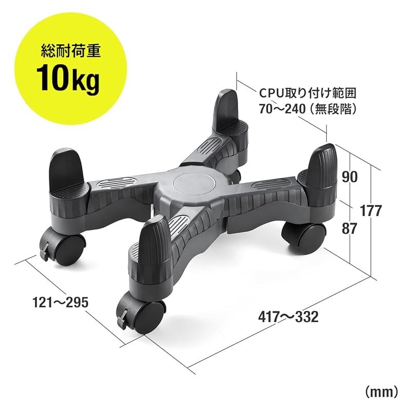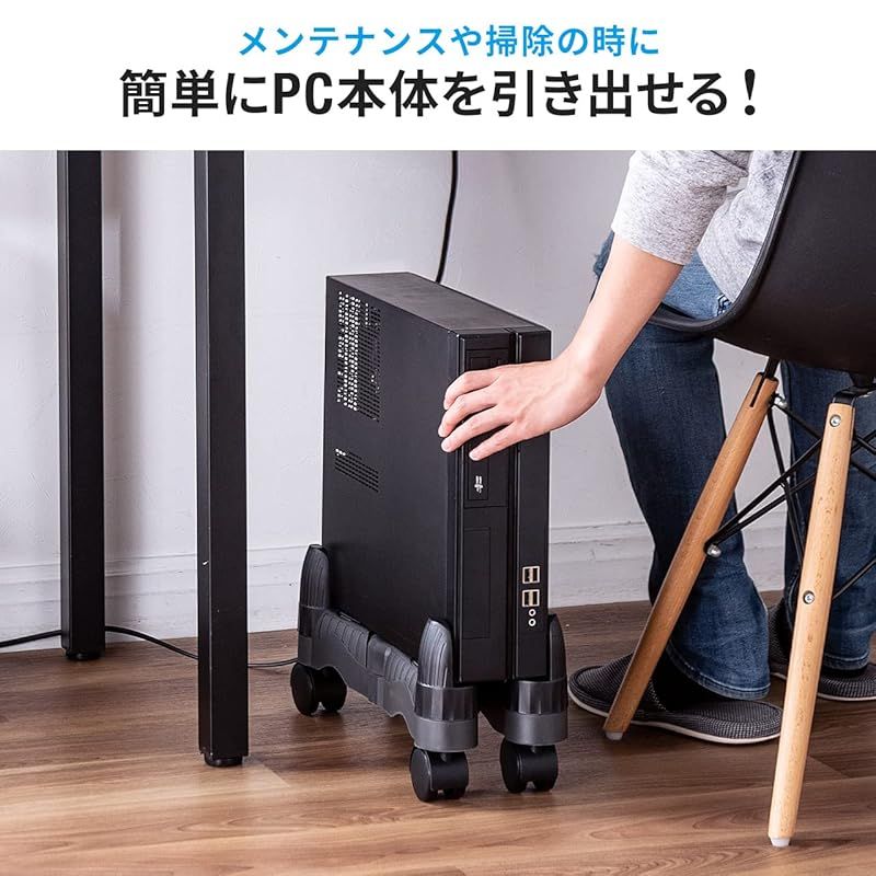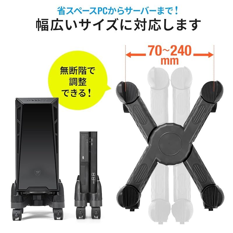 【商品概要】 横幅70~240mmのパソコン本体の設置に対応したPCスタンドです。幅70~240mm間で無断階で横幅を調整できるので、スリムタワーからワイドタワーまで設置可能です。 4隅のサポートで、スタンドからのパソコン落下を防ぎます。サポートは360°動くので、パソコンにぴったりと添わせられます。 デスク下に設置した機器を簡単に引き出すことができます。前2輪には不要に動かないようストッパー付きです。ストッパーとキャスターを挿しこむだけで簡単に組み立てできます。 床面から11.5cm浮かせて設置することでホコリの侵入を最小限まで防ぐことができます。床面から浮かせているので液体を使った掃除をする時も安心です。 期間:初期不良のみ