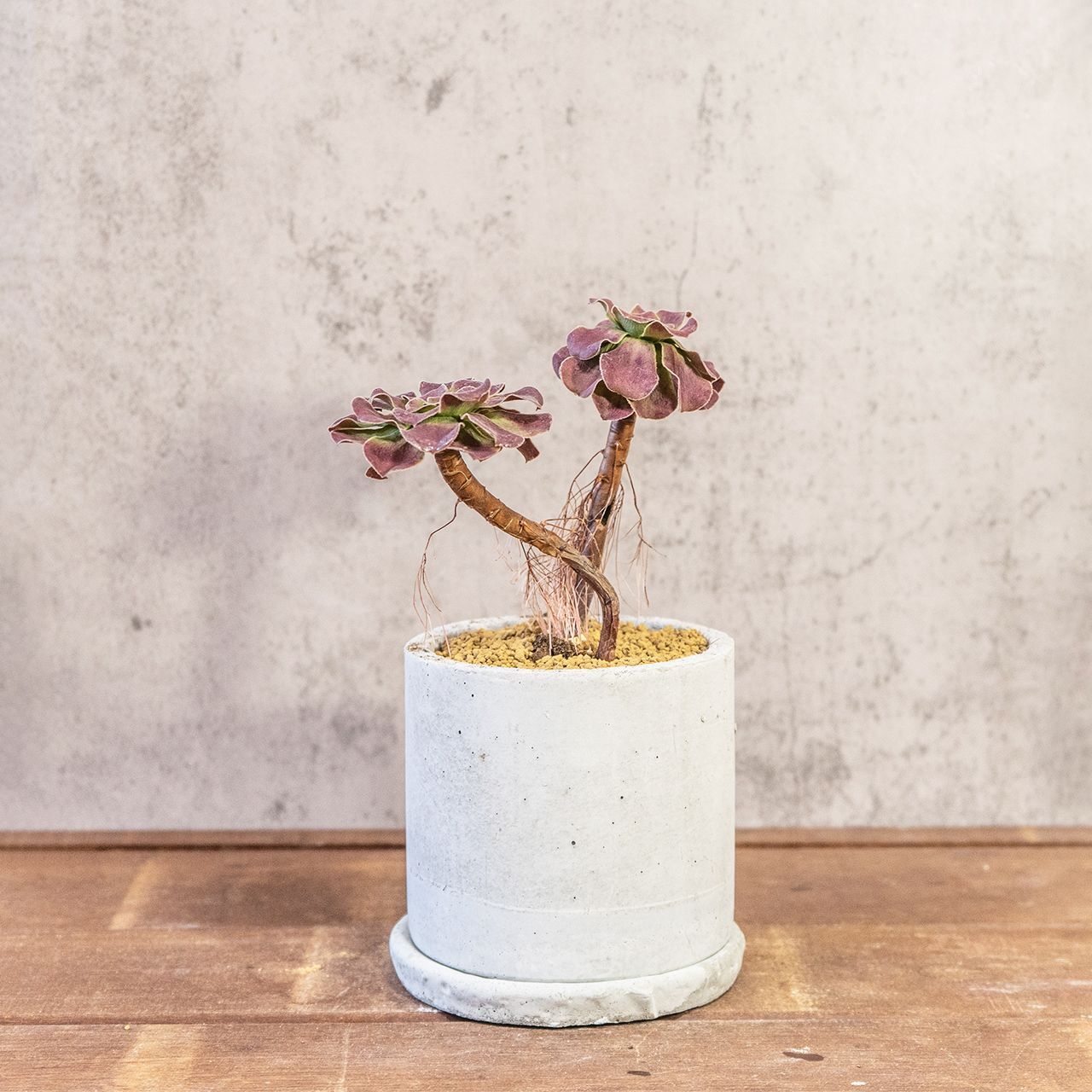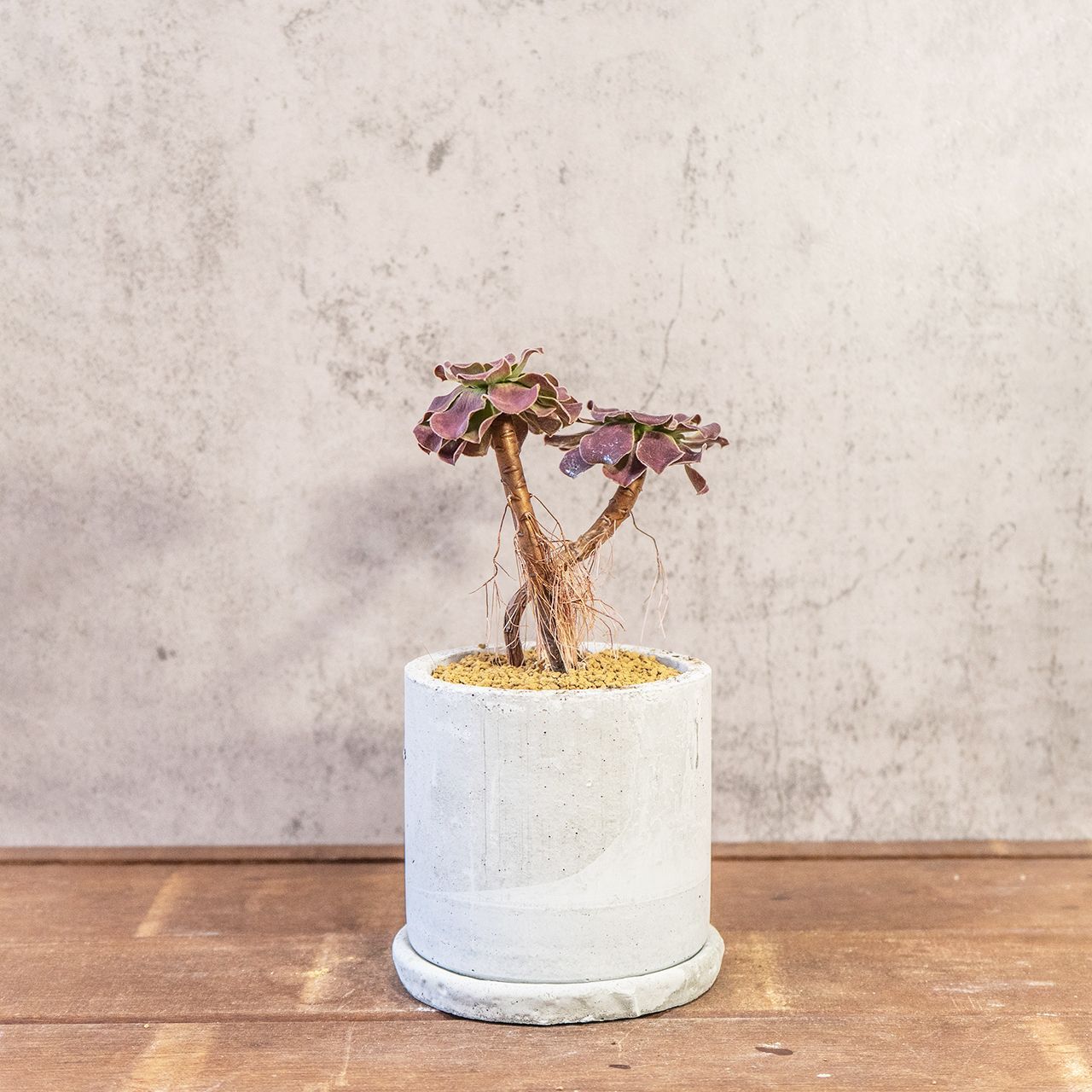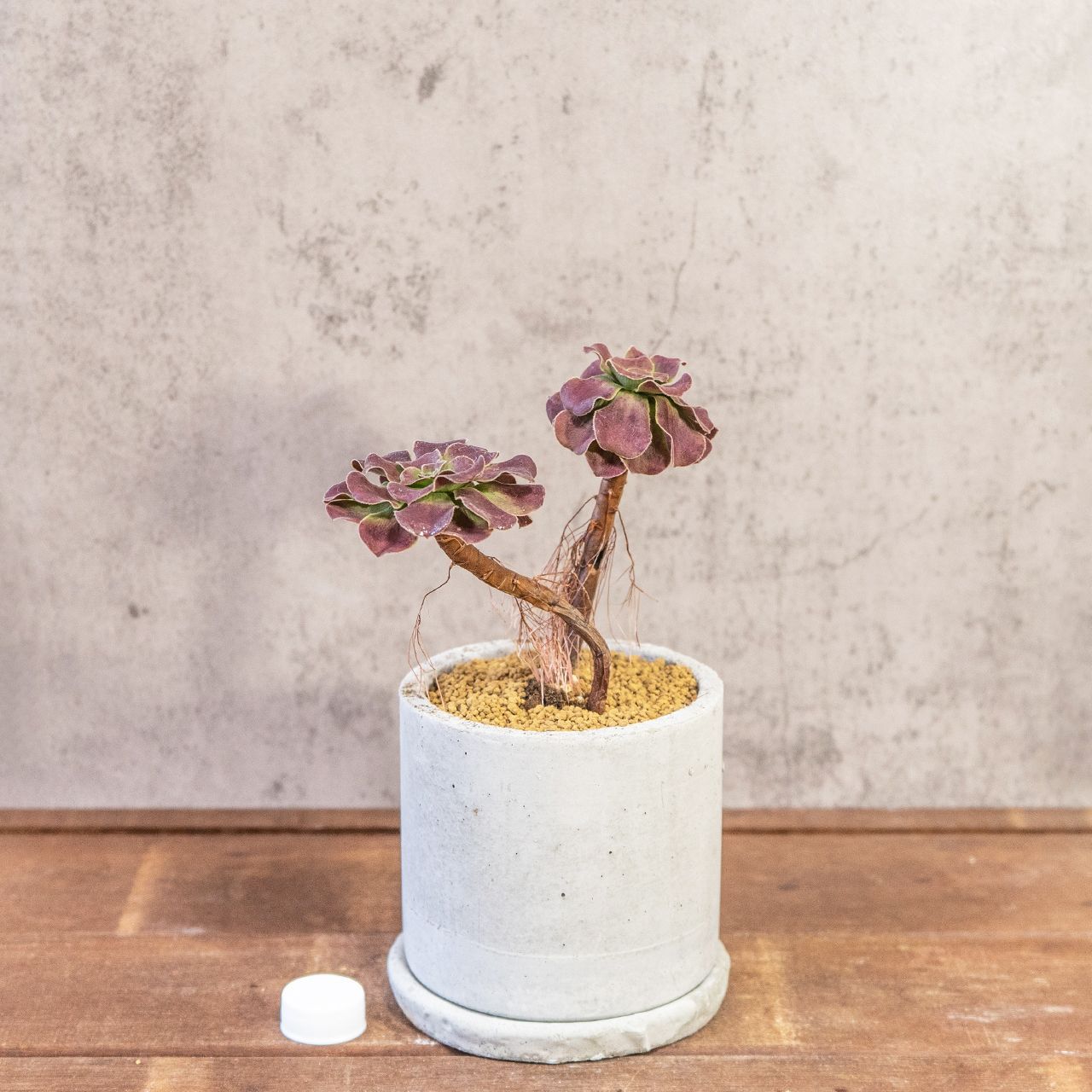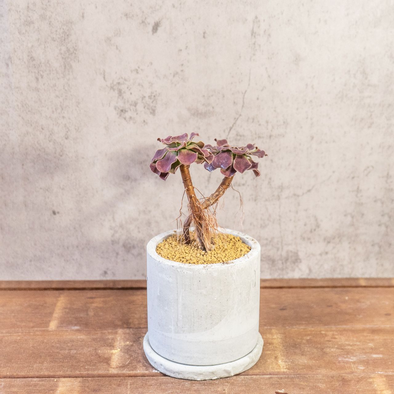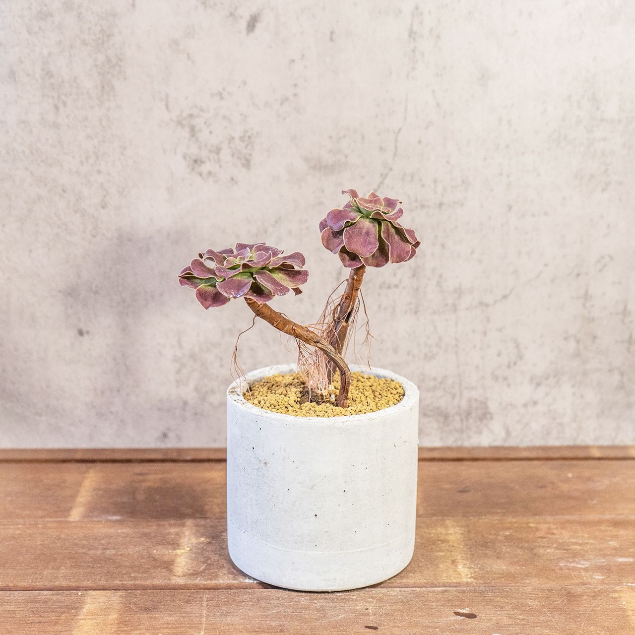 \送料無料【現品】アエオニウム カシミヤバイオレット 盆栽仕立て 深紅の葉 モルタル鉢 多肉植物