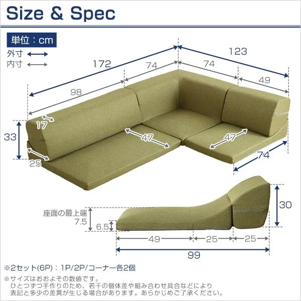 【商品サイズ】 1人掛け:(約)幅49x奥行き74x高さ33cm(座面高:7.5cm) 2人掛け:(約)幅98x奥行き74x高さ33cm(座面高:7.5cm) コーナー:(約)幅74x奥行き74x高さ33cm(座面高:7.5cm) ※各パーツ2個ずつ
