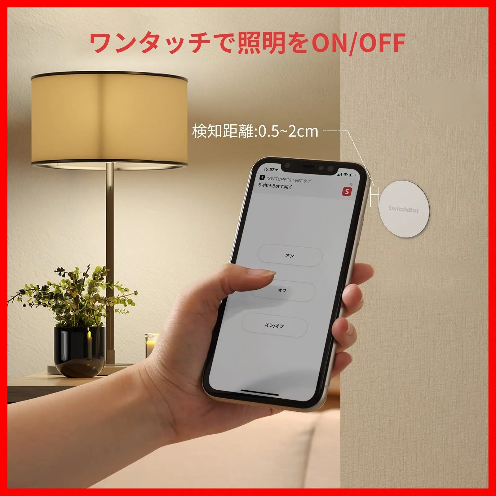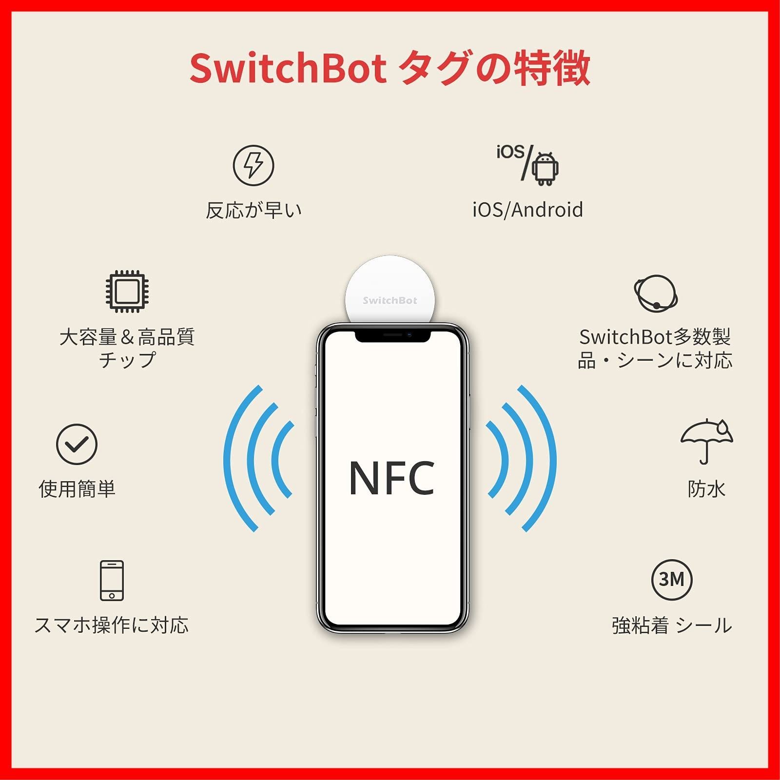 【ワンタッチでSwitchBotシリーズ製品を制御】SwitchBotタグにスマホをかざすと、SwitchBotボットが照明をON/OFF、SwitchBotカーテンがカーテンをON/OFF。現在にはSwitchBotプラグと加湿器のONのみに対応可能。リモートボタンに対応しません。SwitchBot ハブミニと併用すれば、外出先でもSwitchBotデバイスを操作可能。