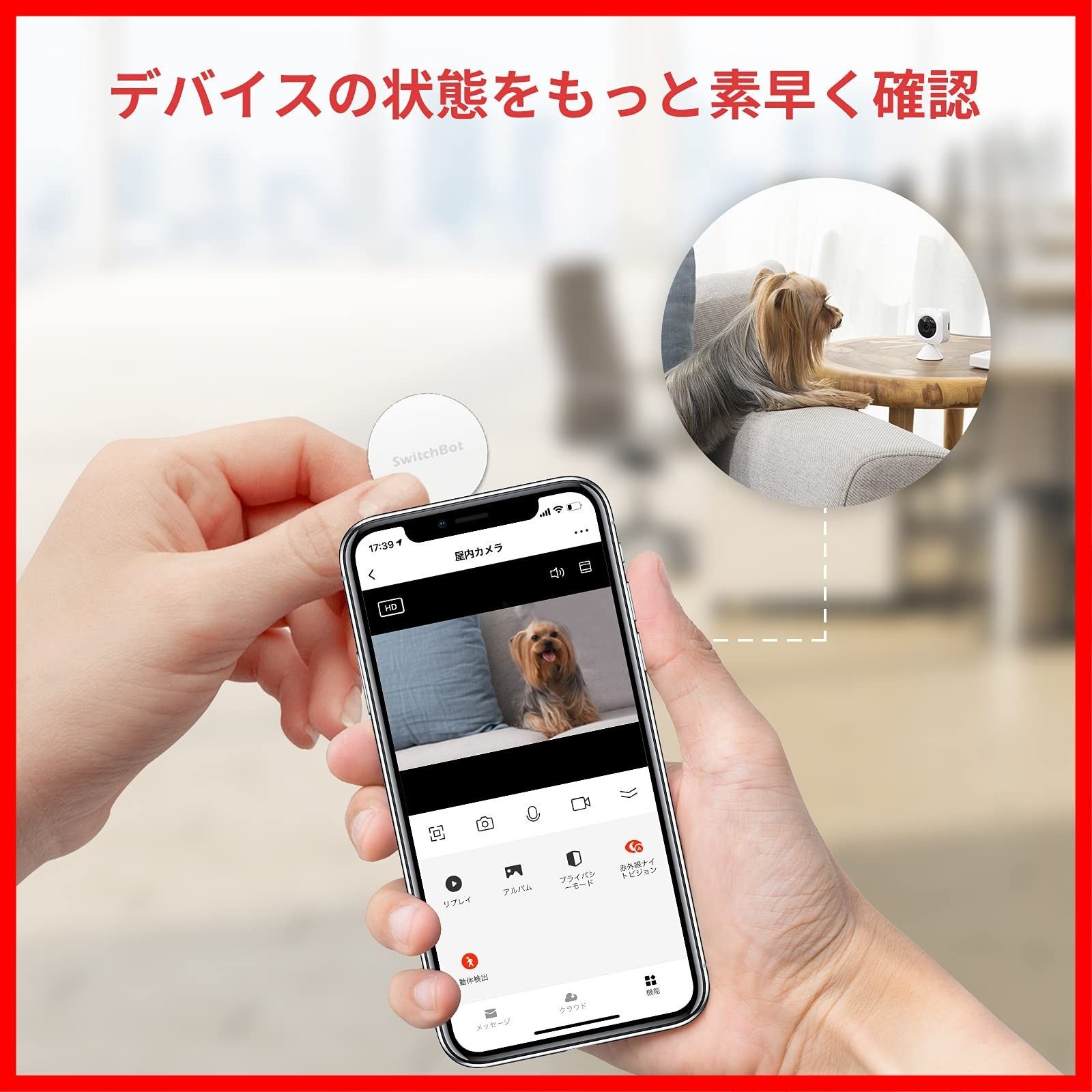 【SwitchBotデバイスの状態をもっと素早く確認】今まで室内の温湿度を確認する際に「SwitchBotアプリを起動→ホームページの温湿度計を選択→デバイスの設定画面で確認」という3ステップが必要です。SwitchBotタグで2ステップに短縮可能。スマホをタグにかざせば、すぐに温湿度計のデータ画面にアクセス可能。SwitchBot屋内カメラにも対応可能。 ワンタッチでSwitchBotシリーズ製品・シーンを簡単に制御する! *********************************************** 上記をご確認頂き、ご購入いただけましたら幸いです。 ご不明な点等ございましたら、 お気軽にお尋ねくださいませ。 最後までご確認頂き誠にありがとうございました。
