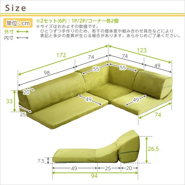 【サイズ】 1人掛け:(約)幅49x奥行き74x高さ33cm(座面高:7.5cm) 2人掛け:(約)幅98x奥行き74x高さ33cm(座面高:7.5cm) コーナー:(約)幅74x奥行き74x高さ33cm(座面高:7.5cm) ※各パーツ2個ずつ ※商品重量:(約)14.2kg