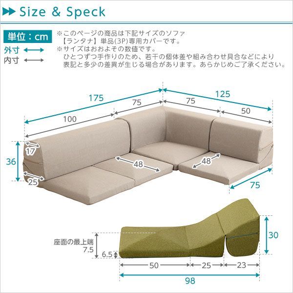 【サイズ】 外寸:1人掛け:(約)幅50x奥行き75x高さ35cm(座面高:7.5cm) 2人掛け:(約)幅100x奥行き75x高さ35cm(座面高:7.5cm) コーナー:(約)幅75x奥行き75x高さ35cm(座面高:7.5cm) ※商品重量:(約)1.6kg