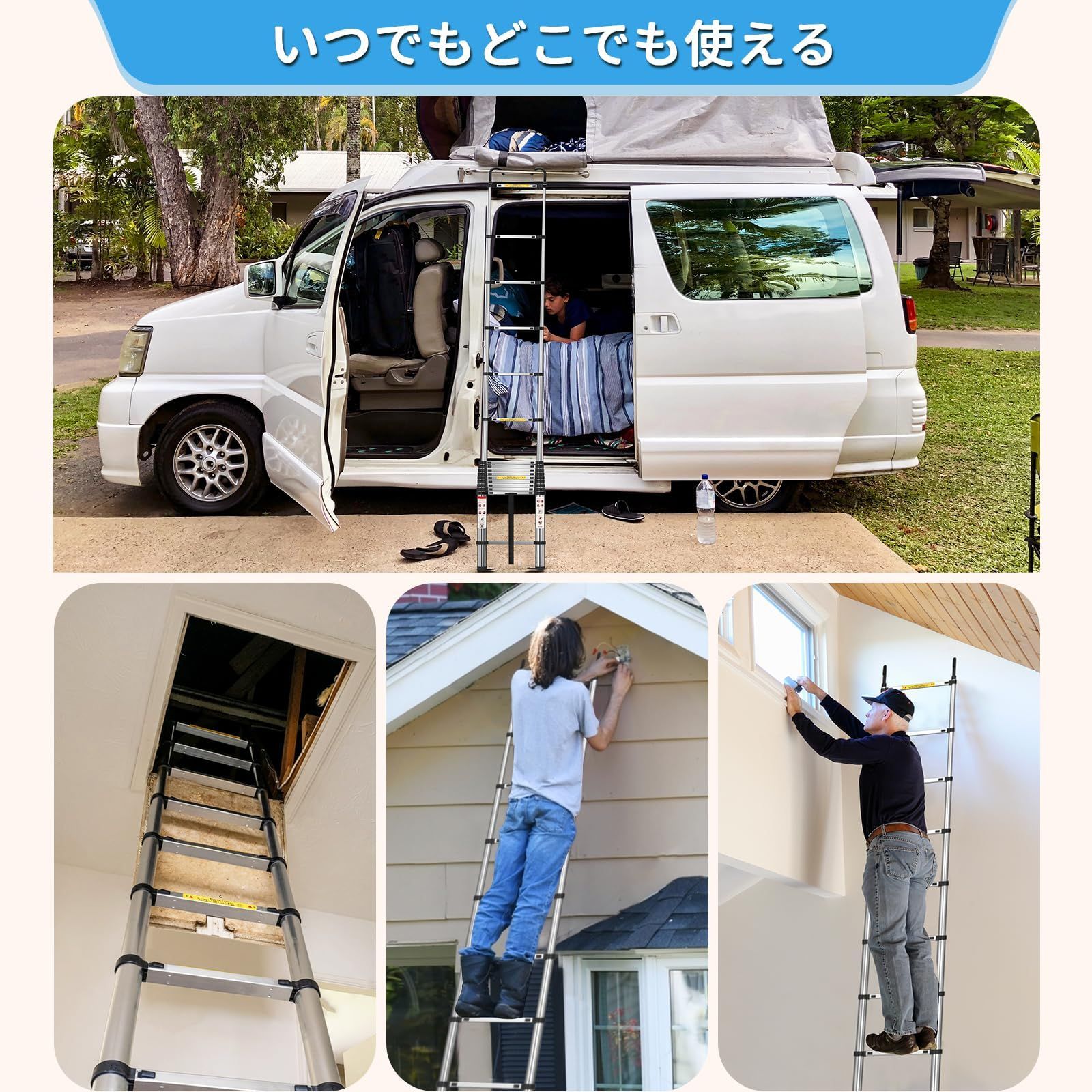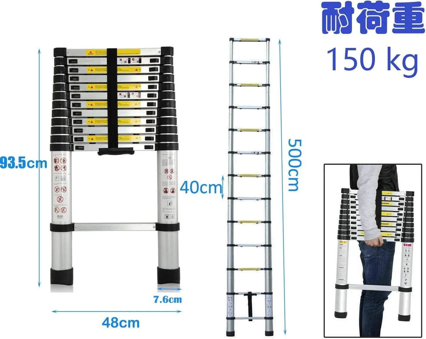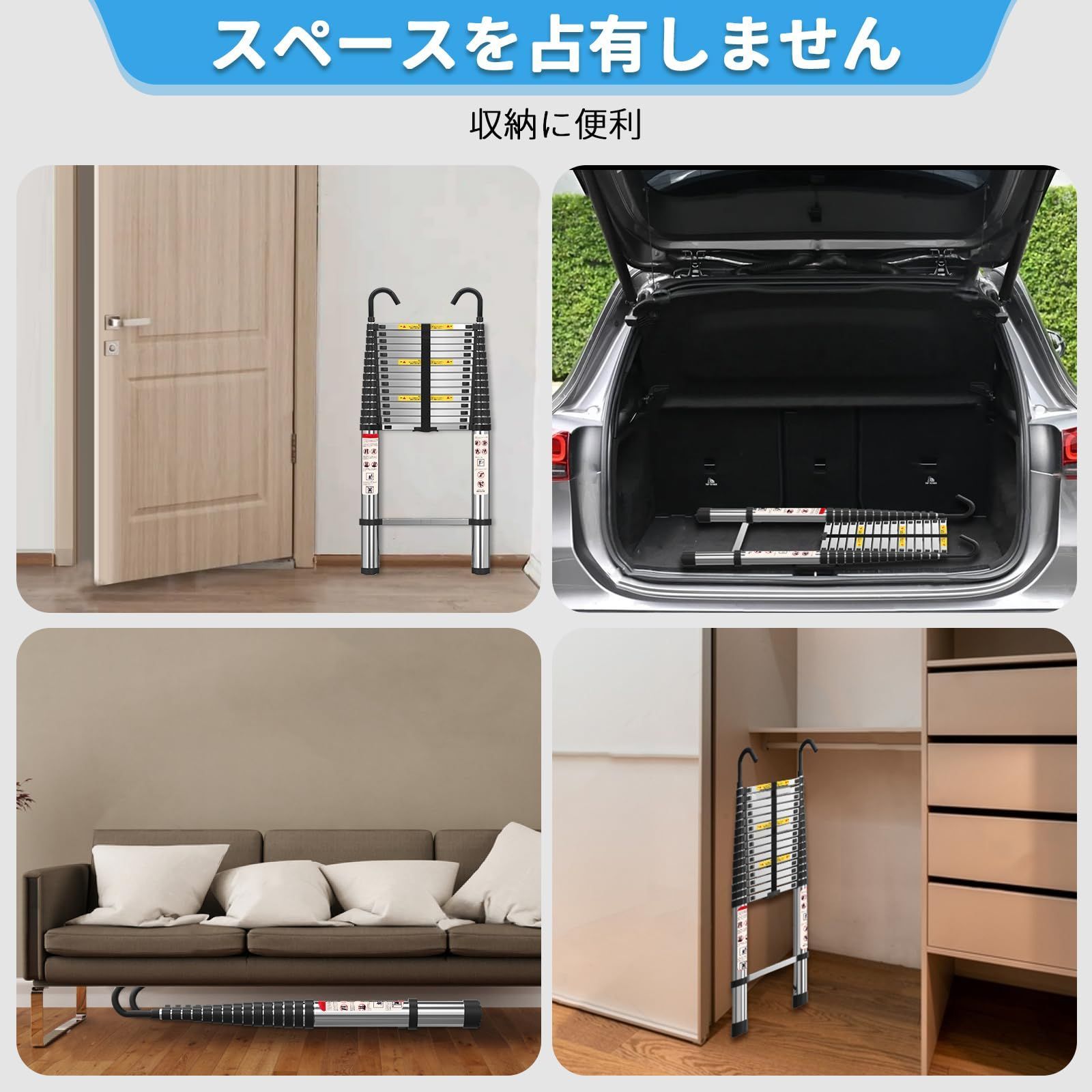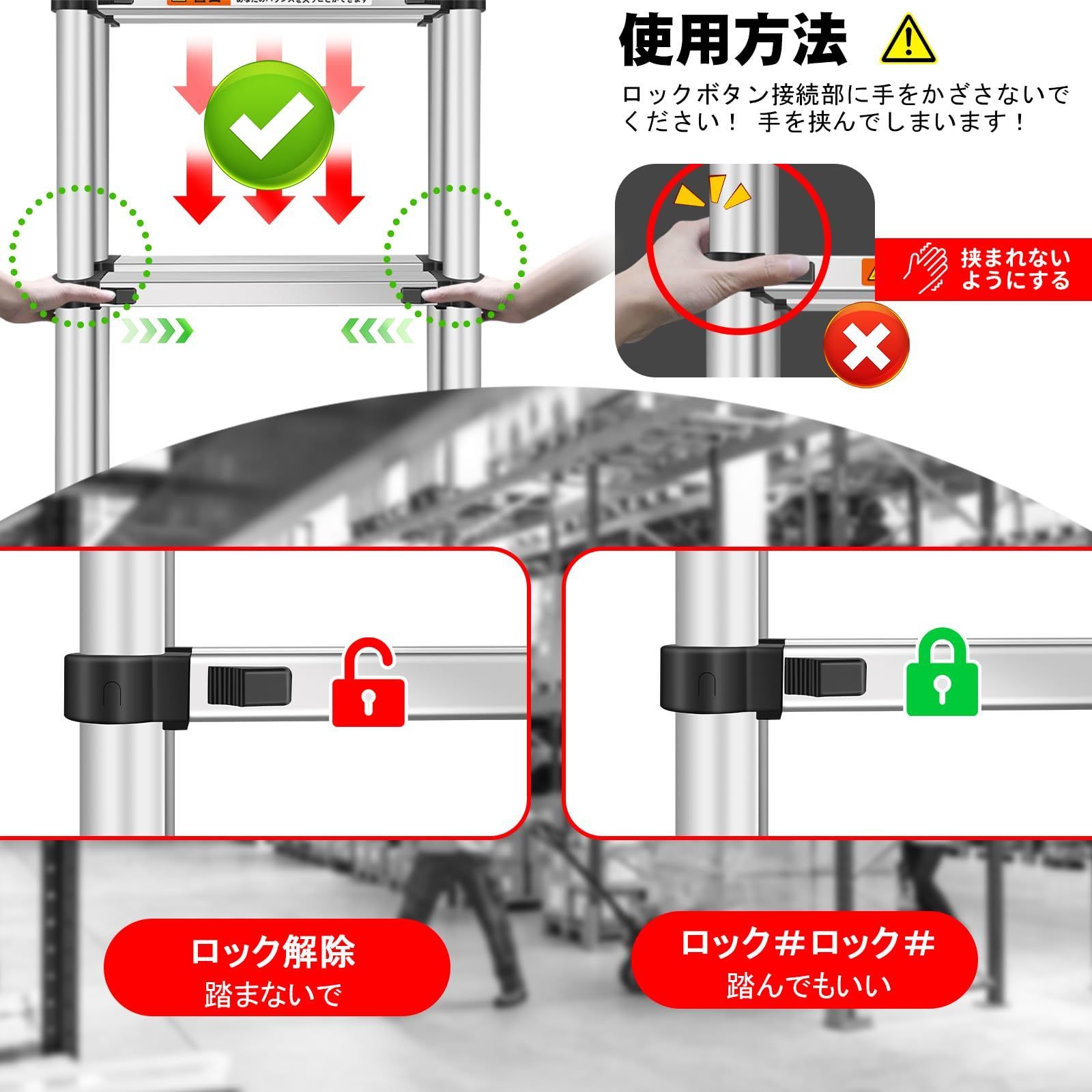 【高品質の伸縮はしご】伸縮はしごは高コストのアルミ合金制、ステンレスは折れやすく、アルミ合金は丈夫で、150kgの荷重を持ちながら、できるだけ軽い品質を実現しています。
