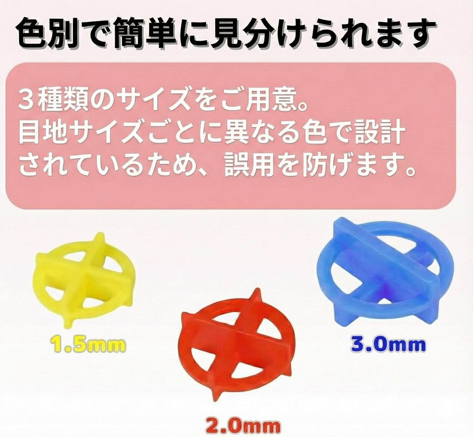 施工箇所のデザインに合わせて、1.5mm(黄色)、2.0mm(赤色)、3.0mm(青色)の3つの厚みから選択可能です。タイル目地の間隔をミリ単位で正確に管理できるため、タイルの種類を問わずプロフェッショナルな施工が可能。3mmスペーサーなどのサイズも一目で見分けられます。安定性に優れた円形十字デザイン