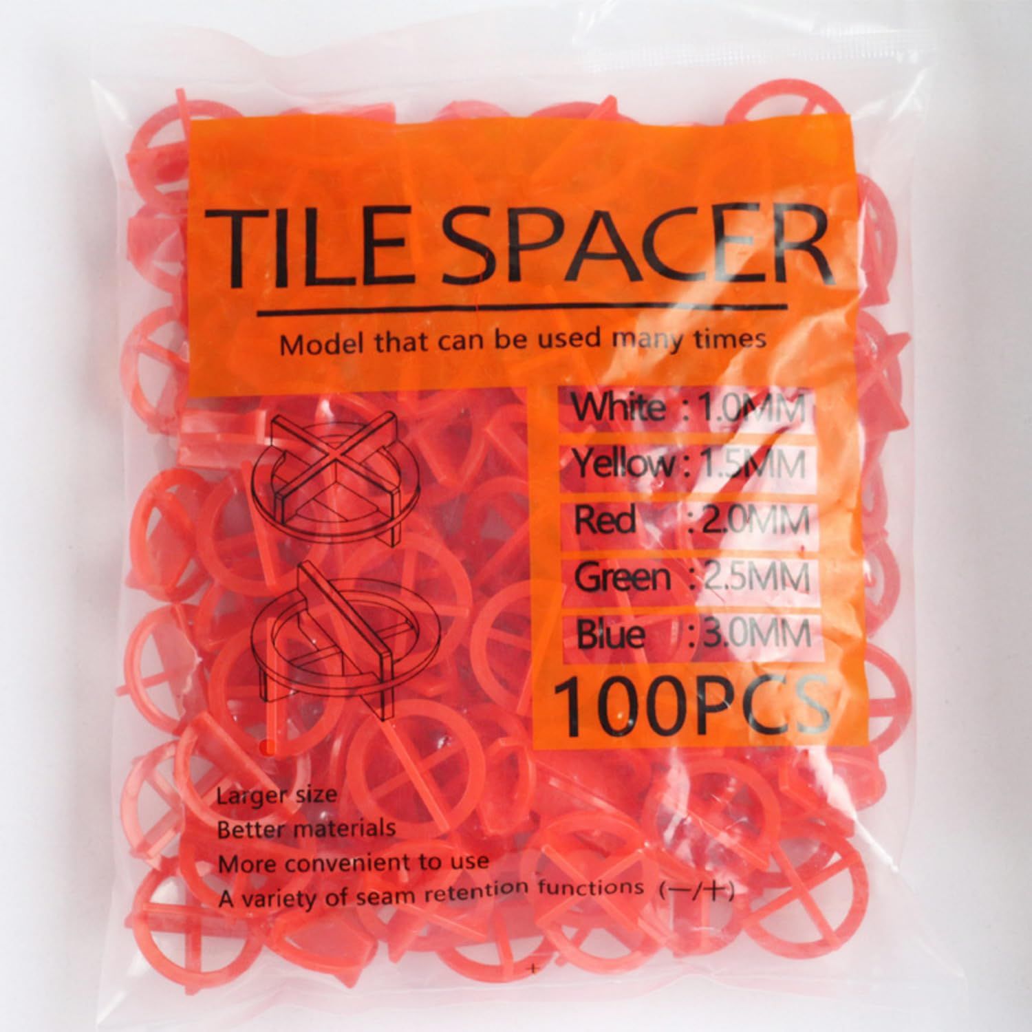 タイル貼りを美しく仕上げるための必須アイテム、円形タイルスペーサー100個セットです。タイルの目地幅を一定に保ち、プロのような均一で綺麗な仕上がりをサポートします。初心者から職人まで幅広く愛用されているタイルの道具です。赤(2.0mm)、黄(1.5mm)、青(3.0mm)の3種類。プロジェクトに合わせた厚みを選べます。特殊な円形デザインは安定感があり、タイルの角にしっかりフィットしてズレを防ぎます。DIYのリフォームや壁面・床面のタイル施工、タイルパッチ作業の効率を大幅に向上。正確な目地調整で、耐久性と美観を両立させた理想の空間作りを実現しましょう。スマートタグのように作業の目印となり、美しい目地ラインを形作ります。