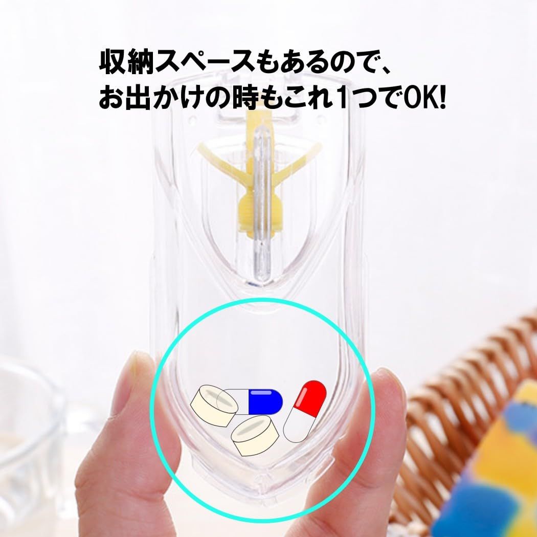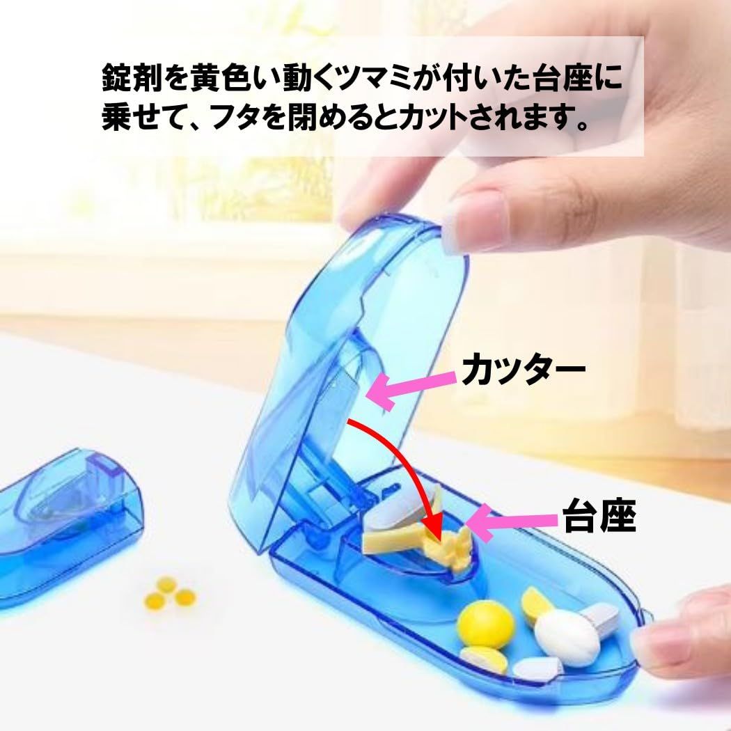 【本体サイズ】約9.0cm x 2.5cm x 4.5cm 動くツマミでいろんなサイズをしっかり固定。ケースを下げてパチンとするだけで、手軽に錠剤を半分カットできます。(錠剤の性質によって、欠けたり・砕けてしまうこともあります) 収納スペースもありますので、お出かけの時もこれ1つでOK!今までお薬の量やサイズにお悩みの方、是非こちらをお試し下さい。