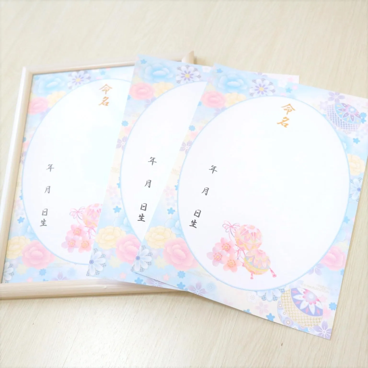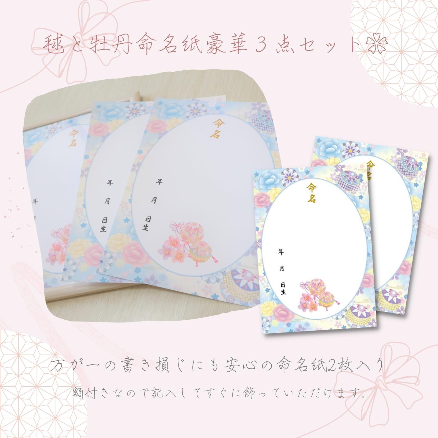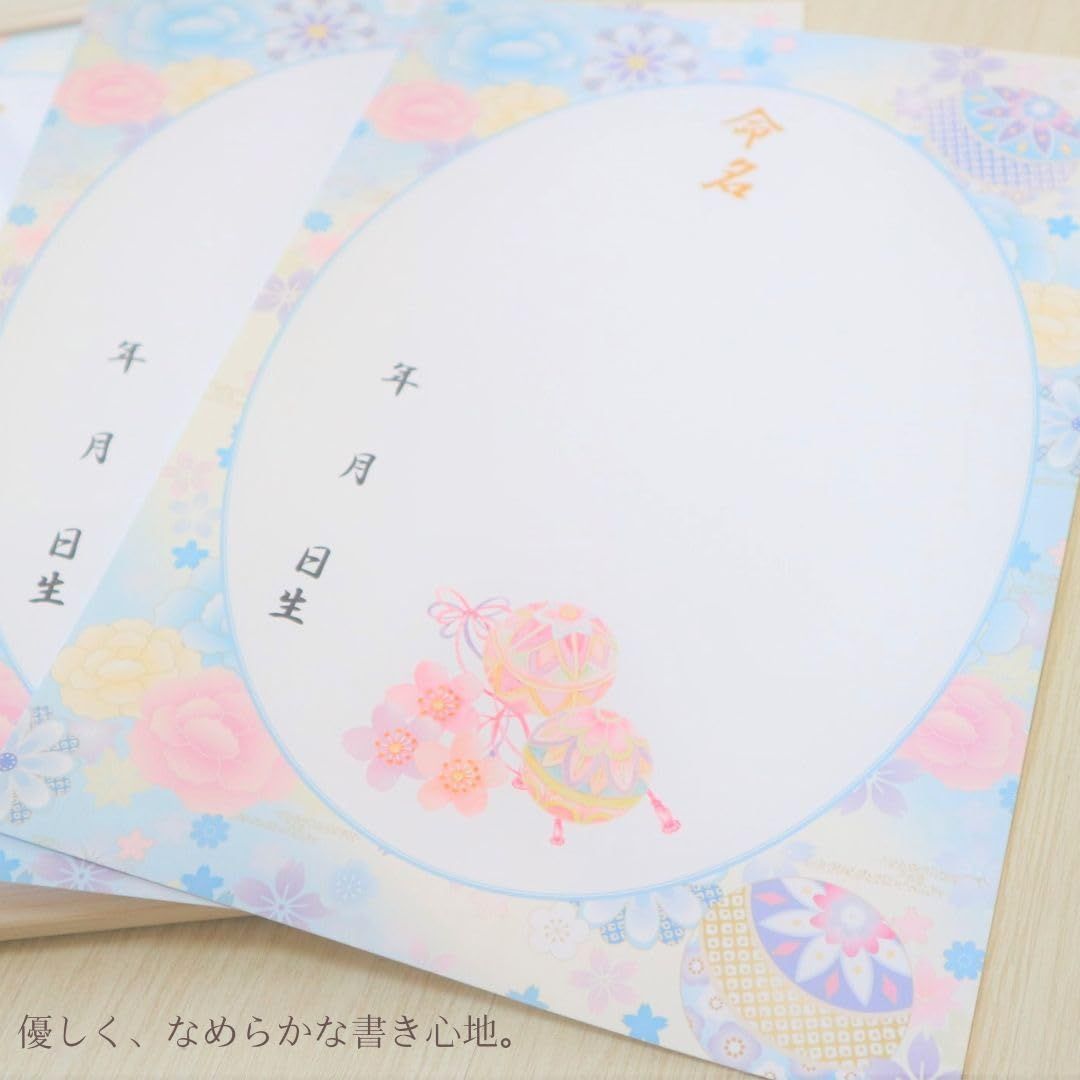 新品 《額&命名紙セット》A4和風命名用紙 毬と牡丹~水色~ 2枚入 軽量額つき 和柄華やぐ命名用紙 縁起の良い毬 令和7年生まれ 2025年生まれ 出産祝い 命名式 お七夜 女の子 男の子 パステルカラー 命名紙 命名書 日本製 MMS008-WH