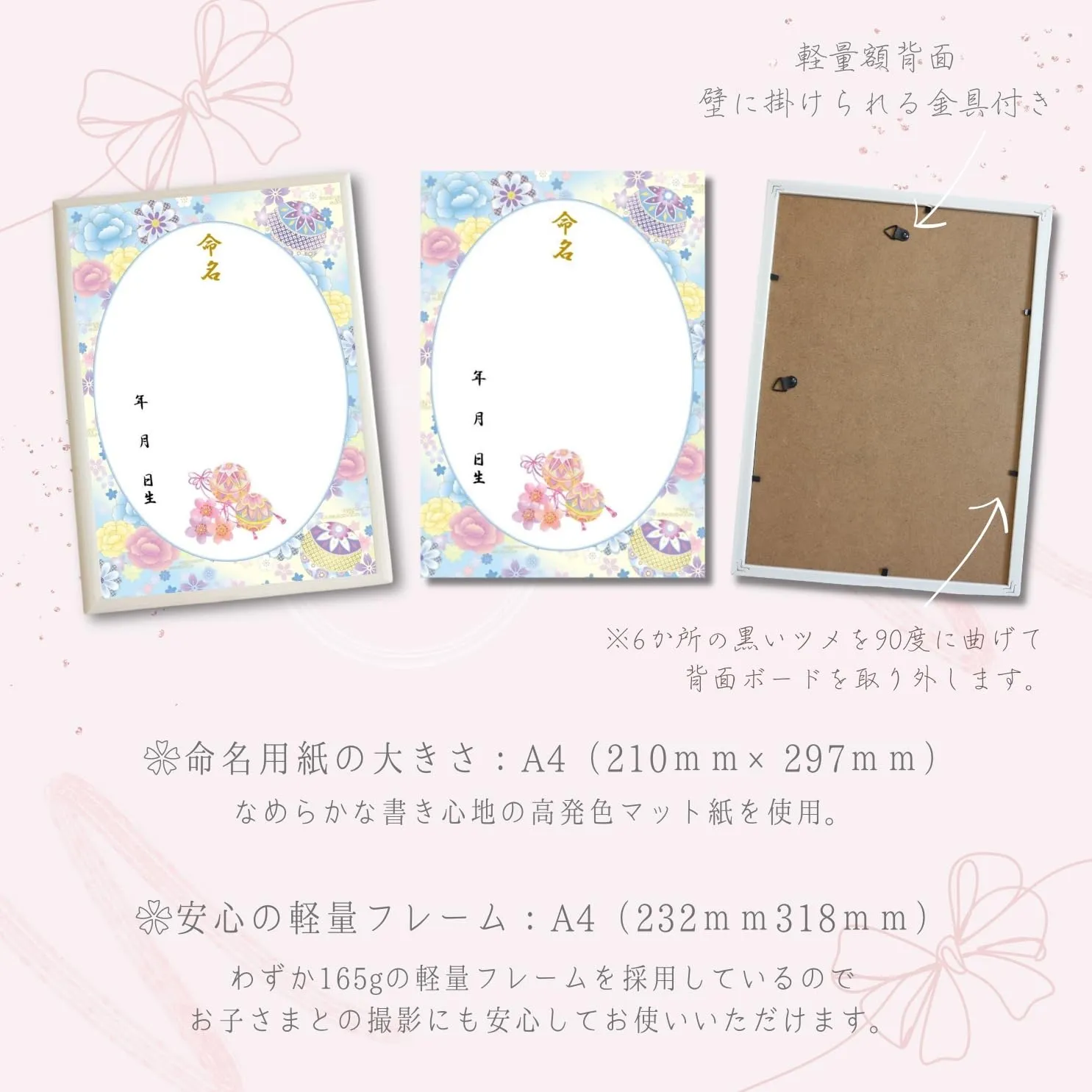 《商品詳細》 ・命名用紙2枚入 ・ガラス等を使用しない軽量フレームを採用。おしゃれな木目調軽量ホワイトフレームでお子様との撮影にも安心。・用紙サイズ(210×297mm)フレームサイズ (232×318mm)・高発色で高品質のマット用紙を採用。高発色かつ高品質紙使用のためサラサラとなめらかで書きやすく、水性・油性ペン共に滲みません。(墨汁 非推奨)