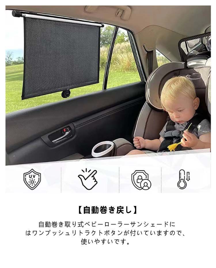 【自動巻き戻し】自動巻き取り式ベビーローラーサンシェードにはワンプッシュリトラクトボタンが付いていますので、使いやすいです。各サンシェードには吸盤が付いていますので、左から順に助手席サイドウィンドウにサンシェードを取り付けることができます。
