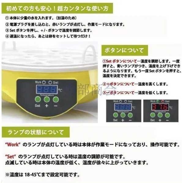 【仕様】 入卵数:7個 入力電圧:110V 電力(W):20W 調節可能な温度:18?45℃ サイズ:18×18×17cm