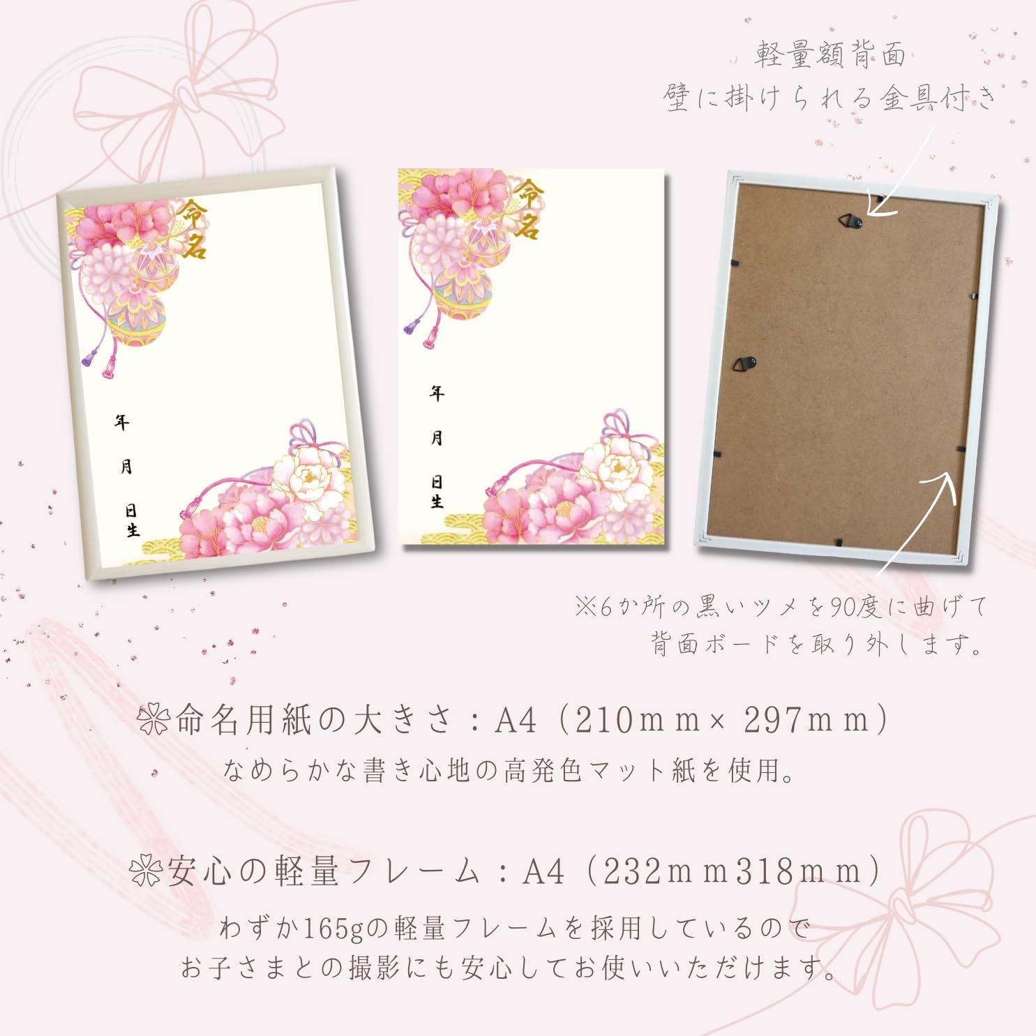 【命名紙セット】A4和風命名用紙 2枚入り 華やか和柄 命名紙 命名式 お七夜 縁起の良い牡丹 出産祝い 軽量白額つき お七夜 命名式 令和6年生まれのお子様 命名書 日本製 MMS001-WH 命名紙 2枚入り おしゃれな軽量ホワイトフレームつき A4サイズ 約232×318mm 高発色・高品質紙使用 日本製 《商品詳細》 ・命名用紙2枚入り ・ガラス等を使用しない軽量フレームを採用。おしゃれなホワイト軽量フレームでお子様との撮影にも安心。・用紙サイズ(210×297mm)フレームサイズ (232×318mm)・高発色で高品質のマット用紙を採用。 高発色かつ高品質紙使用のためサラサラとなめらかで書きやすく、水性・油性ペン共に滲みません。(墨汁 非推奨)大切な命名紙ですので、ひとつひとつ丁寧な梱包を心がけています。 折れ曲がりを防ぐ厚紙と、透明のOPP袋にお包みして水濡れのないようお届けさせていただきます。プレゼントにも安心してお任せいただける仕様となっています。 最後までご確認頂き誠にありがとうございました。 上記をご確認頂き、ご購入いただけましたら幸いです。 何かご不明な点がございましたらお気軽にメッセージからお問い合わせ下さい。