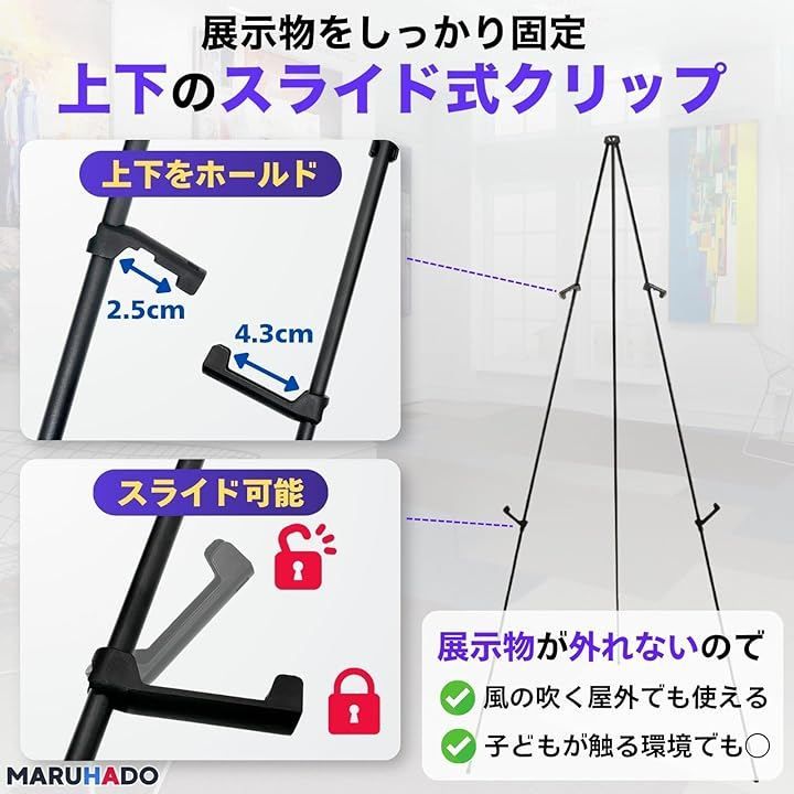 「多用途で汎用性抜群」高さ調整可能なクリップで絵画、ポスター、ウェルカムボードなど様々な掲示物に対応。
