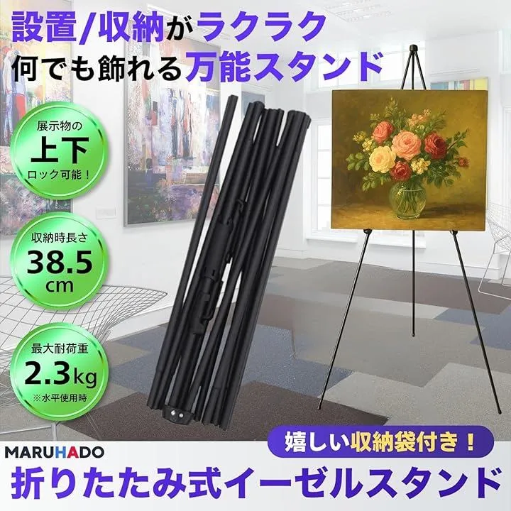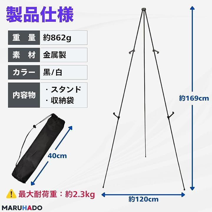 「商品内容」イーゼル本体、収納袋 「材質」合金製 「耐荷重」約2.3kg 「サイズ」組立時:長さ約169cm、幅約120cm 折り畳み時:長さ約38.5cm 重量:862g 「カラー」ブラック(黒)、ホワイト(白) 「注意点」*屋外・野外ご使用時はできるだけ平らな面に設置してください。