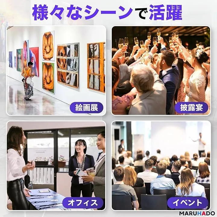室内・野外問わず、イベント、展示会、会議、看板掲示など幅広いシーンで活用できる汎用性抜群なスタンドです。