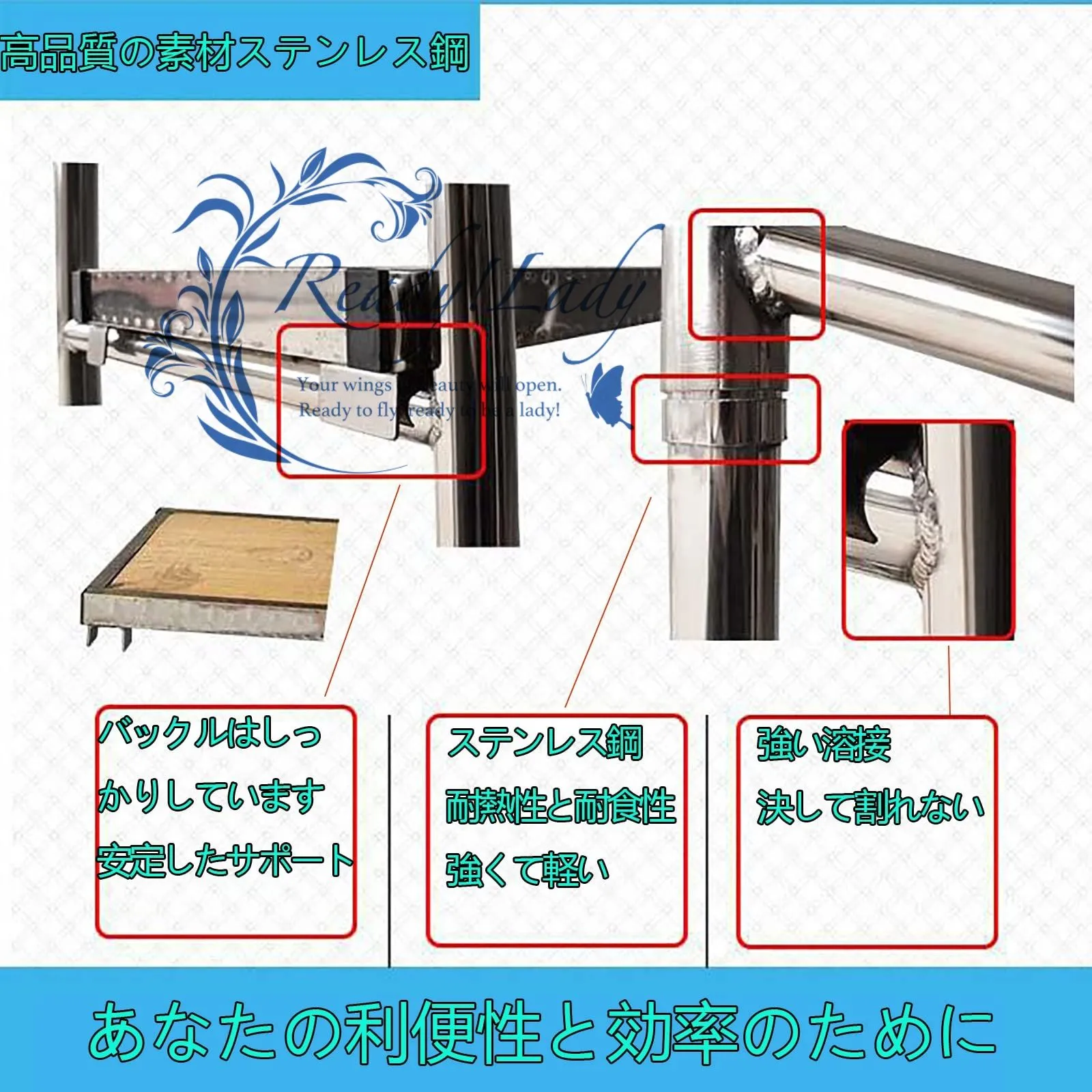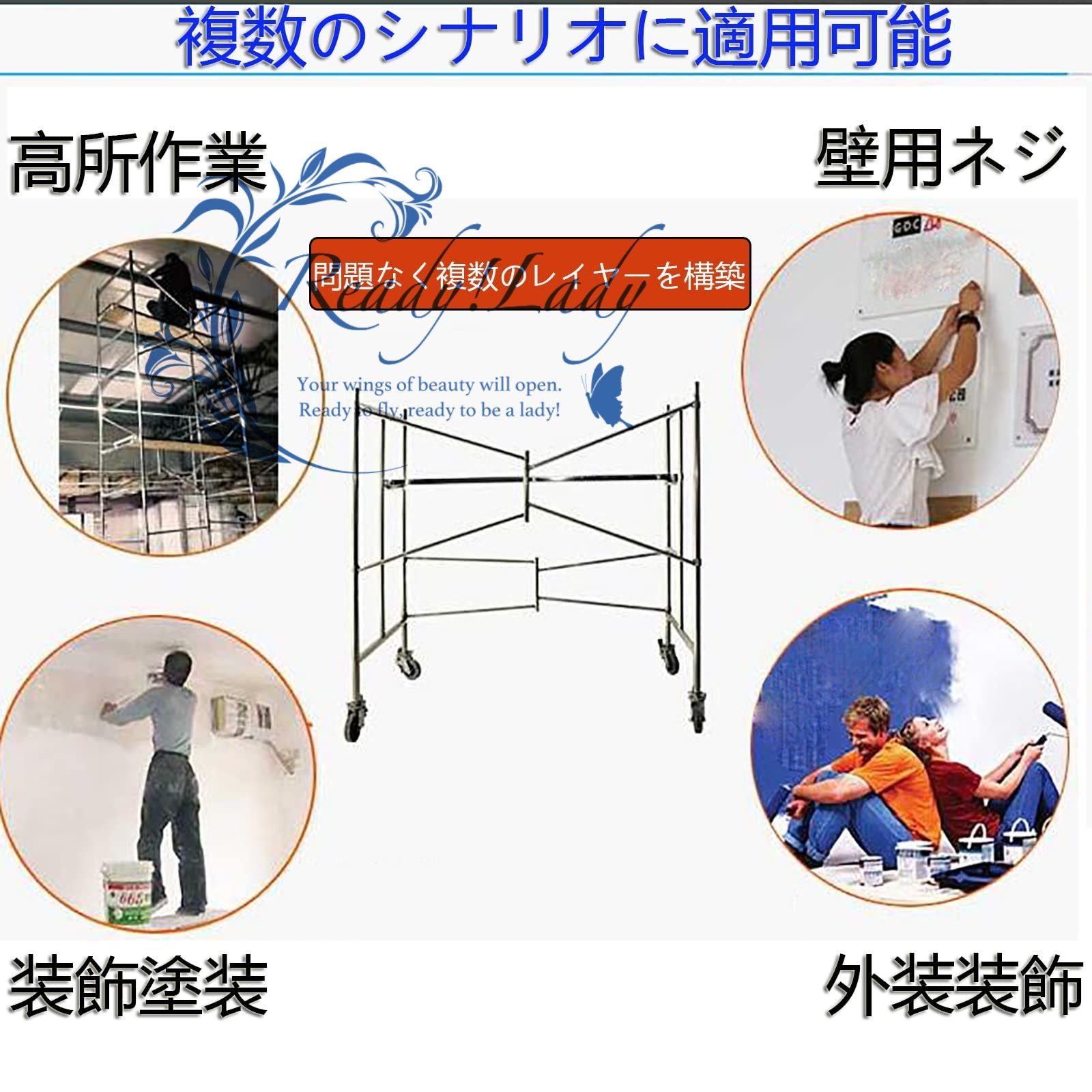 ◆安全・安心:固定ネジと強力釘の二重保護、足場の移動が楽な足場、足場、移動足場、ブレーキ、キャスター、滑り止め付き大型ペダル、安全・安心。