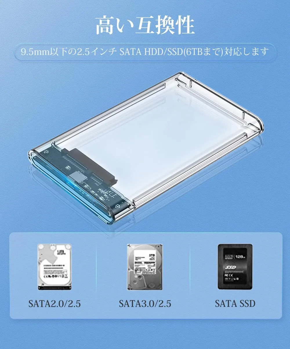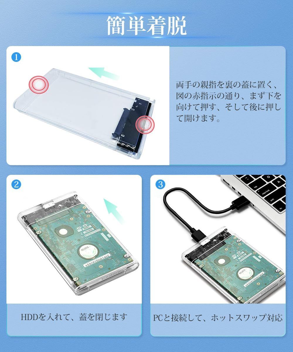 【透明設計】透明なケース、内部構造をよく見えるデザイン、HDD・SSDの型番、サイズ等一目でわかります。 3.
