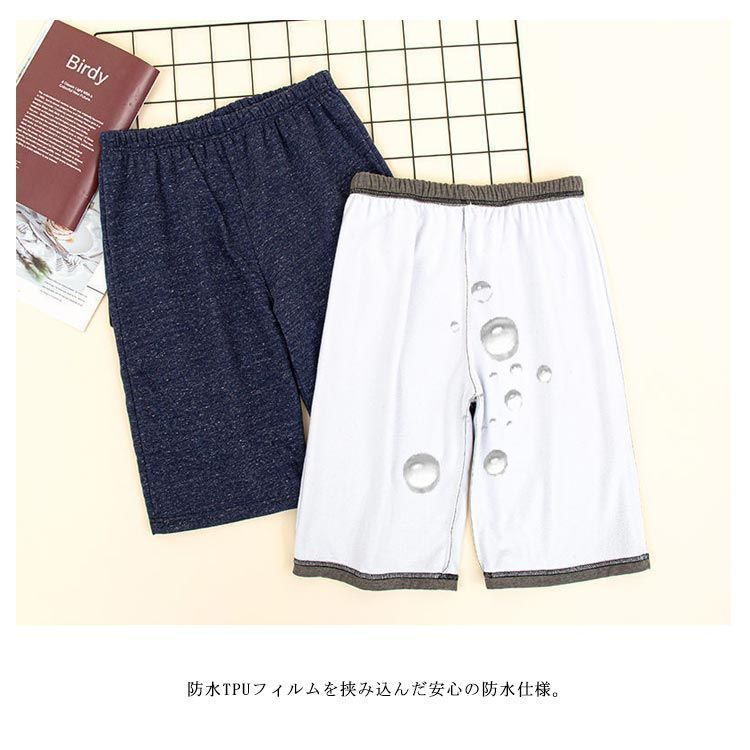 素材:綿 TPU 色:ダークグレー ネイビー 防水布付きの膝丈のおねしょパンツ。 防水TPUフィルムを挟み込んだ安心の防水仕様。 表地/裏地は通気性に優れているコットン素材を使用。ムレも気になりません。 ウエストに調節ゴム付き!フィット感よく使用できます。 見た目は普通のズボンと変わらないので、パジャマのズボンの代わりに履くだけ♪