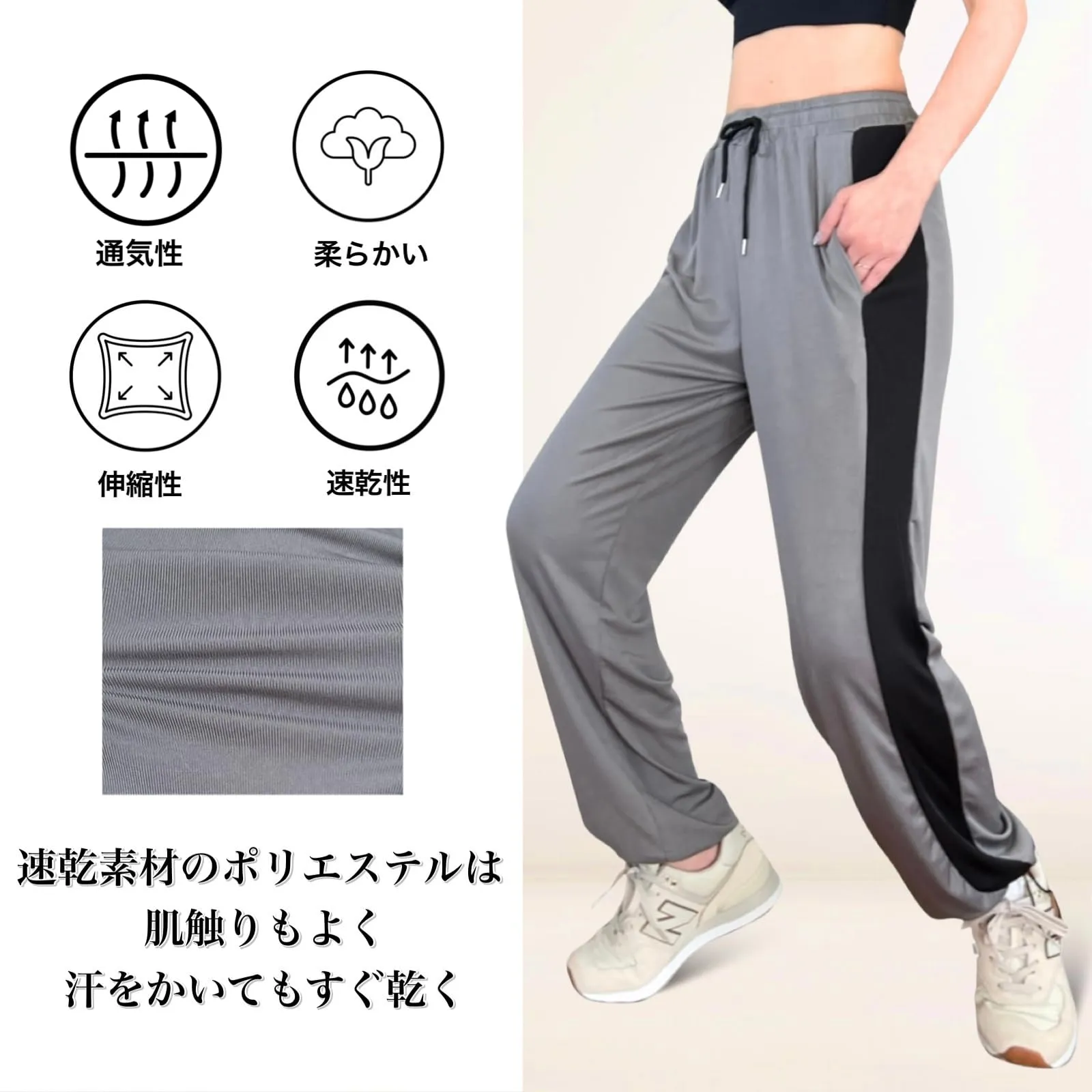【優れたストレッチ性】伸縮性に優れた素材でとにかくよく伸びる!ヨガ、フィットネス、 ダンス、ピラティスなどの激しい動きからランニング、ウォーキングなどさまざまなシーンでも動きをさまたけません。ストレスのない履き心地はリラックスウェア、普段着としてもご利用いただけます。