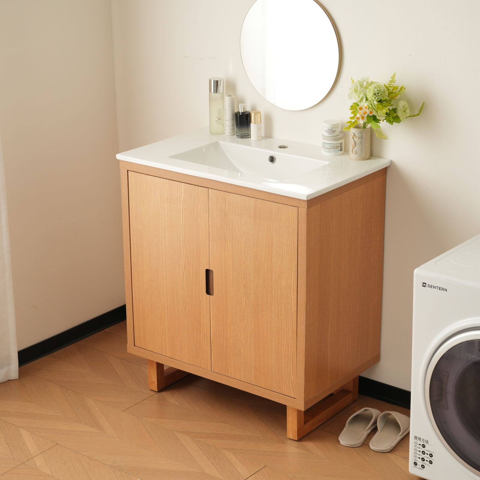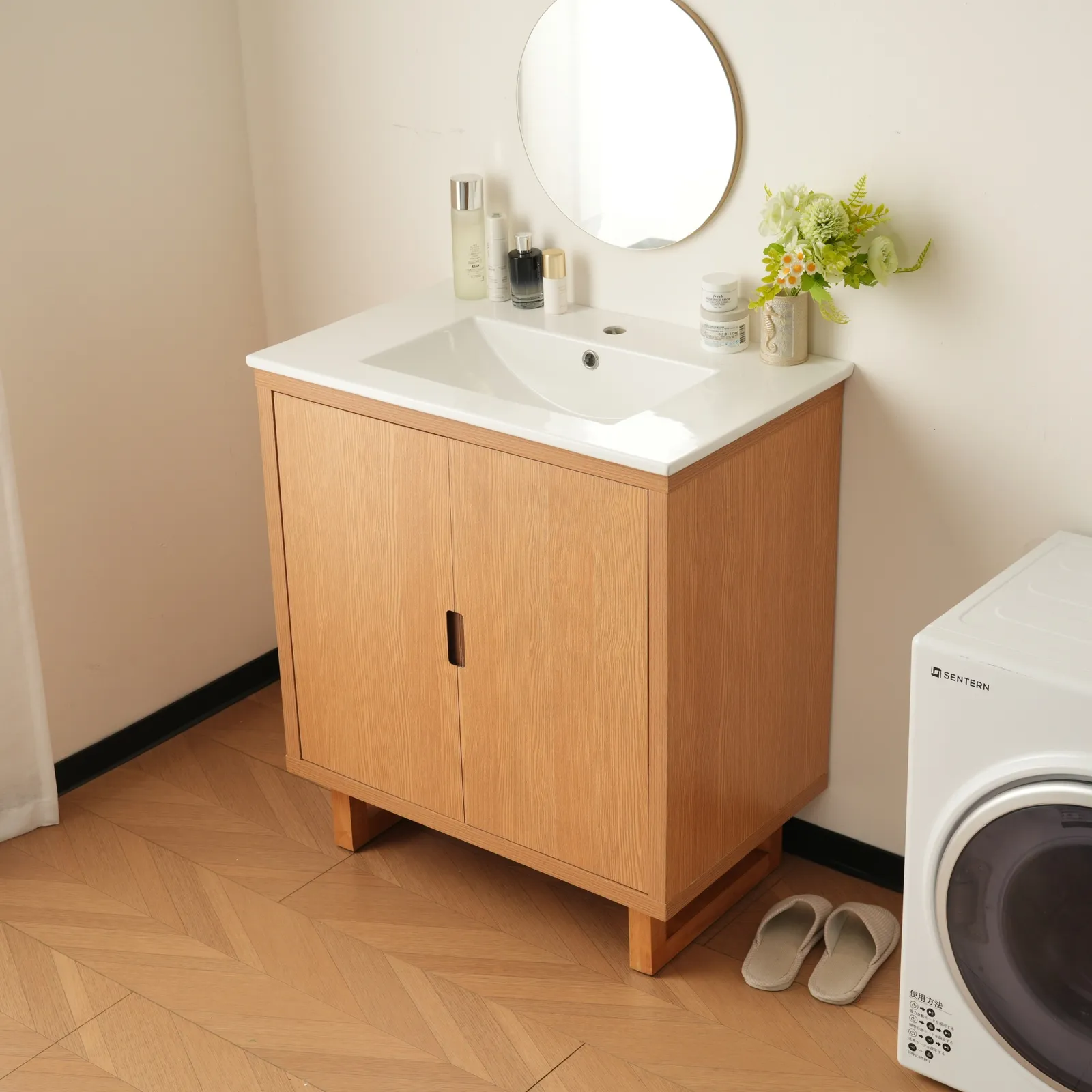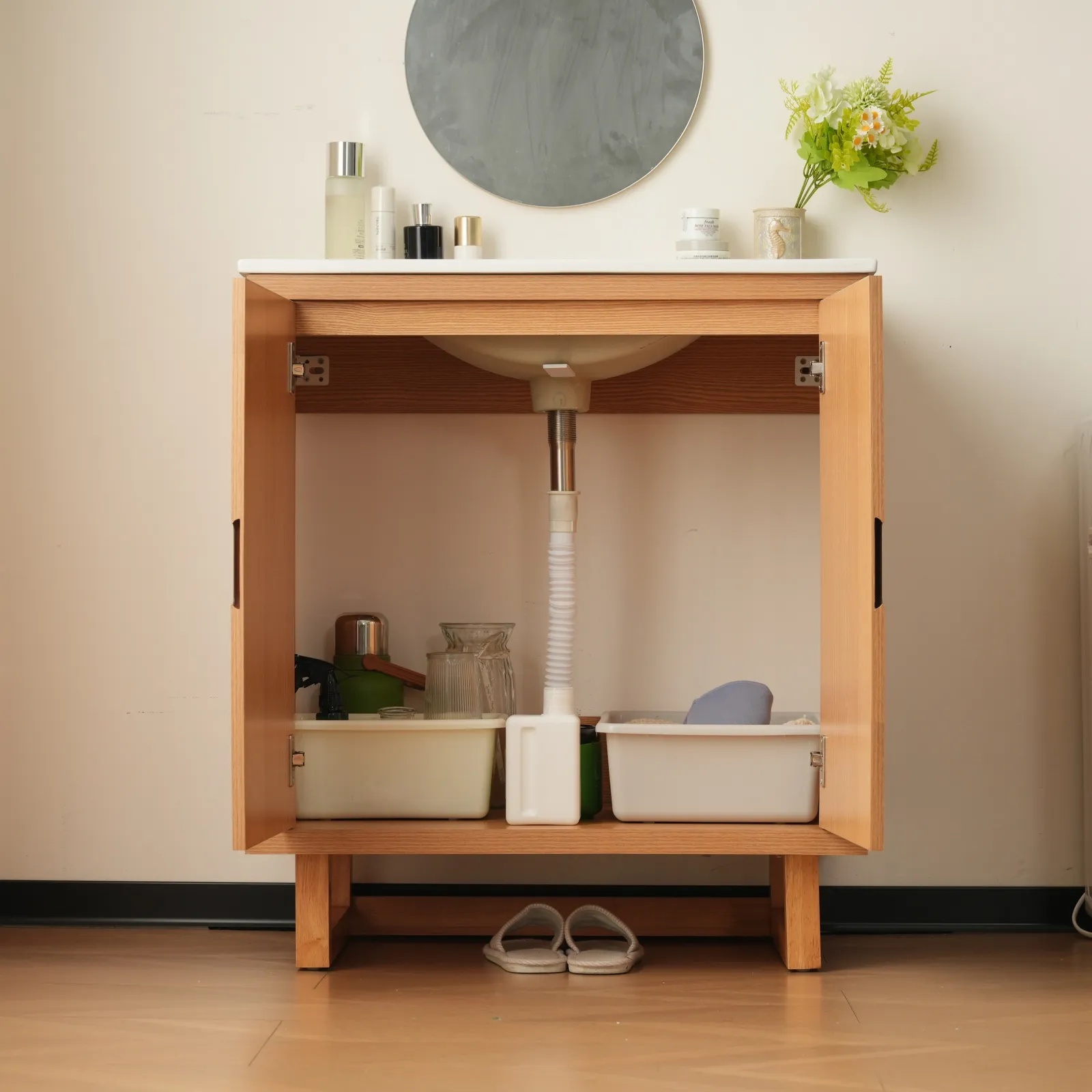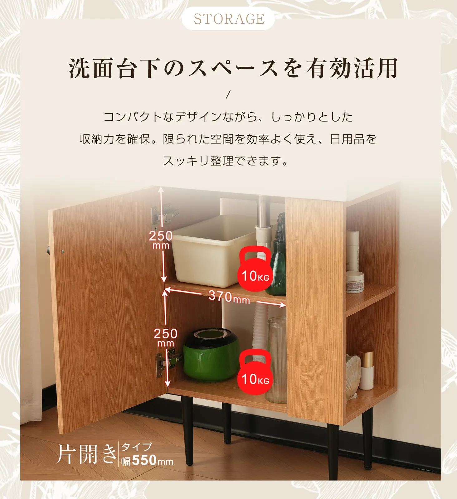 【安定感のある脚設計と実用的な収納スペース。】しっかりとした脚部構造で安定感を保ちつつ、下部にはゆとりのある収納スペースを確保。トイレスリッパやバス用品など、日常的に使う物をすっきりと収納でき、バスルームをより快適な空間に整えます。